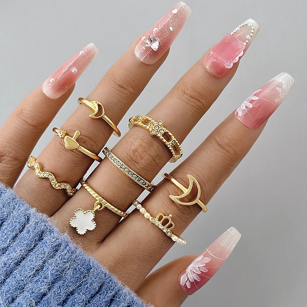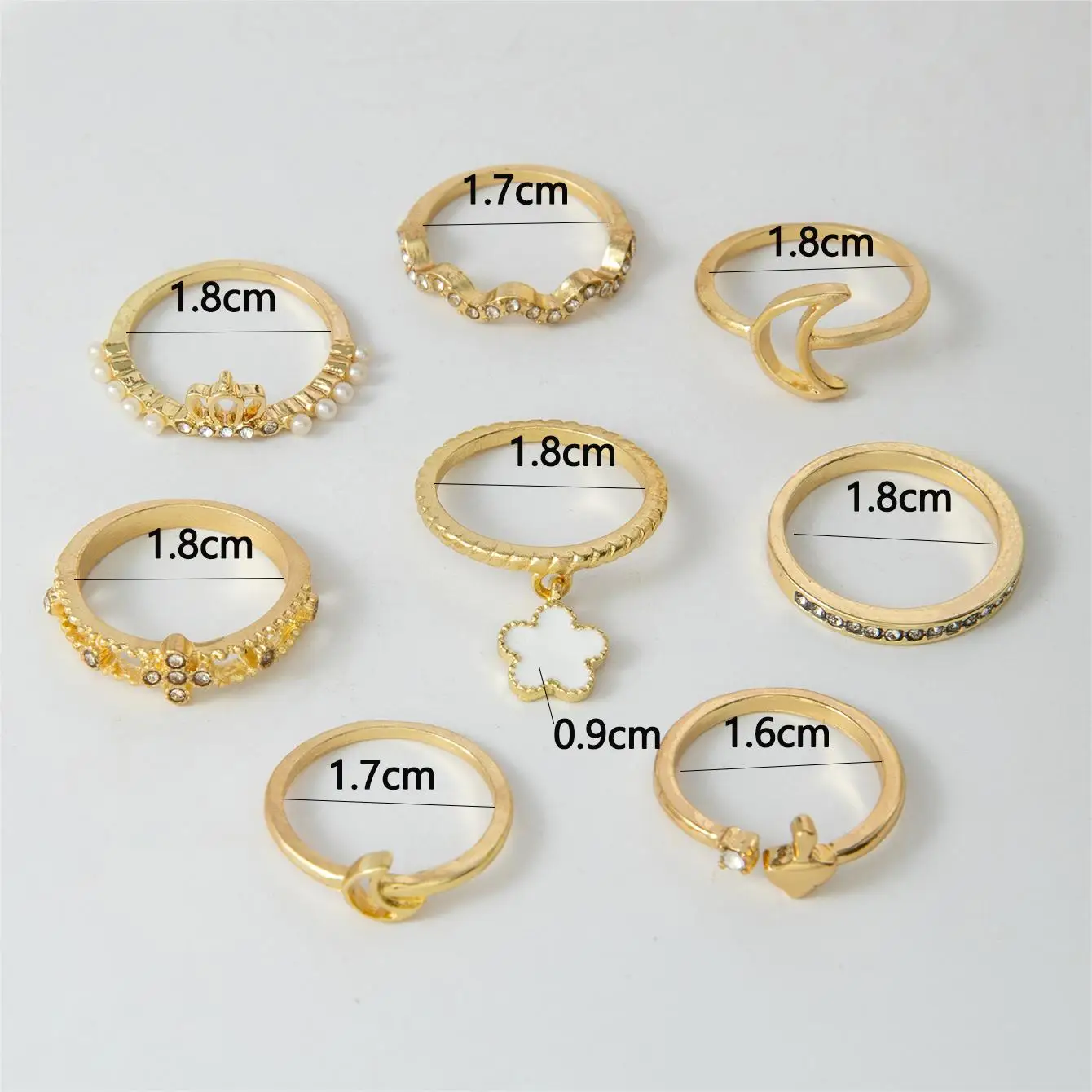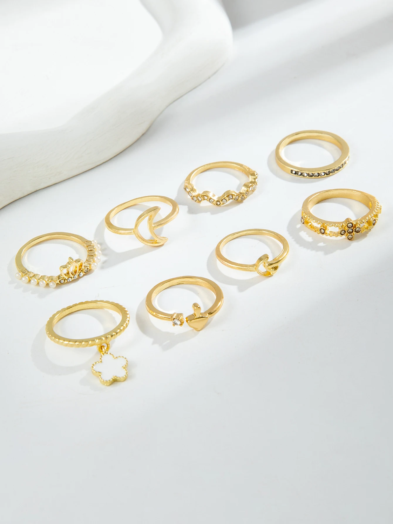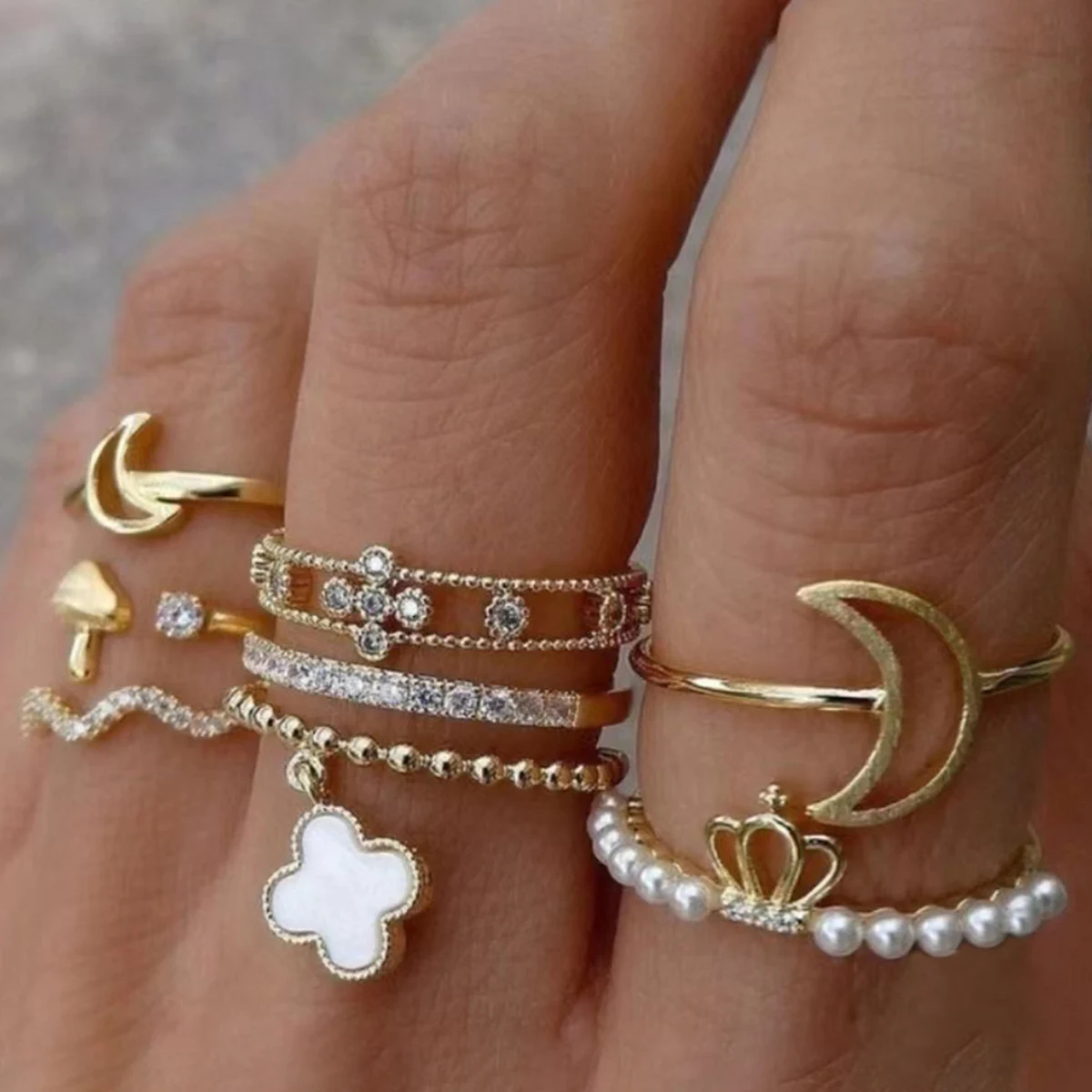 Fleepmart Flower Finger Ring Sets for Women Simple Crescent Moon Metal HollowPoint Drill Jewelry Party Anillos 8Pcs/Set