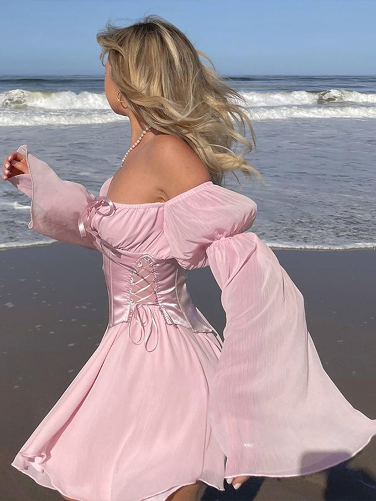 Fleepmart Folds Corsets Flare Sleeve Slash Neck Loose Dresses Japanese Y2K Patchwork Pleated Elegant New Summer Sexy Party Dress