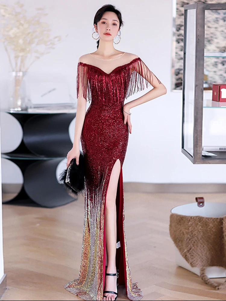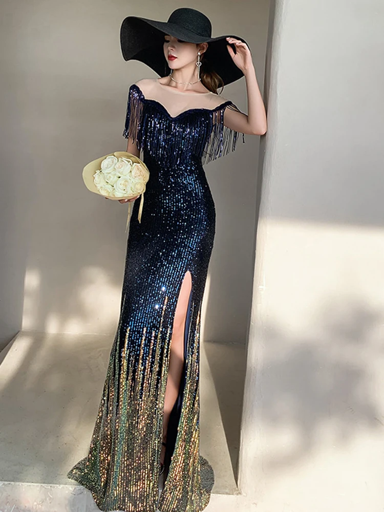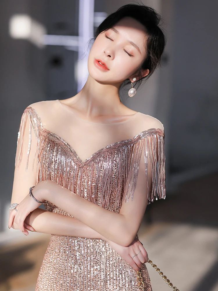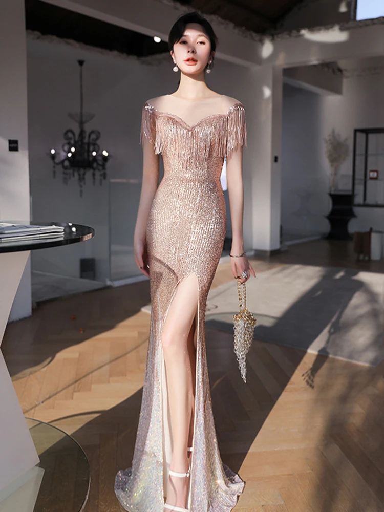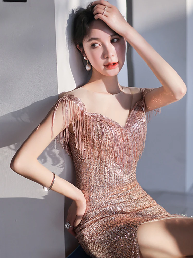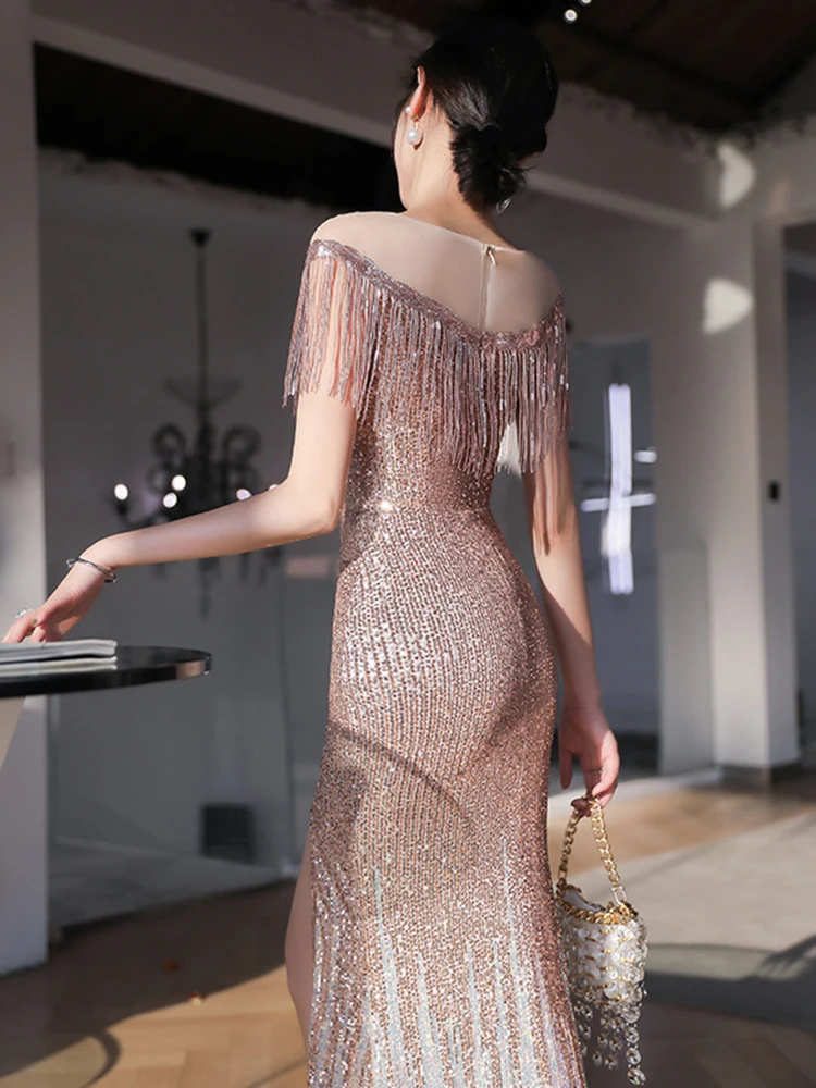 Fleepmart Formal Cocktail Dress Tassels Cape Rose Gold Party Gowns Sexy Side Split Floor Length Shinning Sequind Occasion Vestidoes 2022
