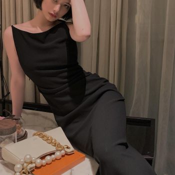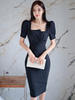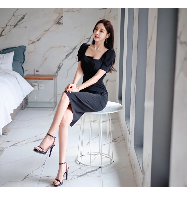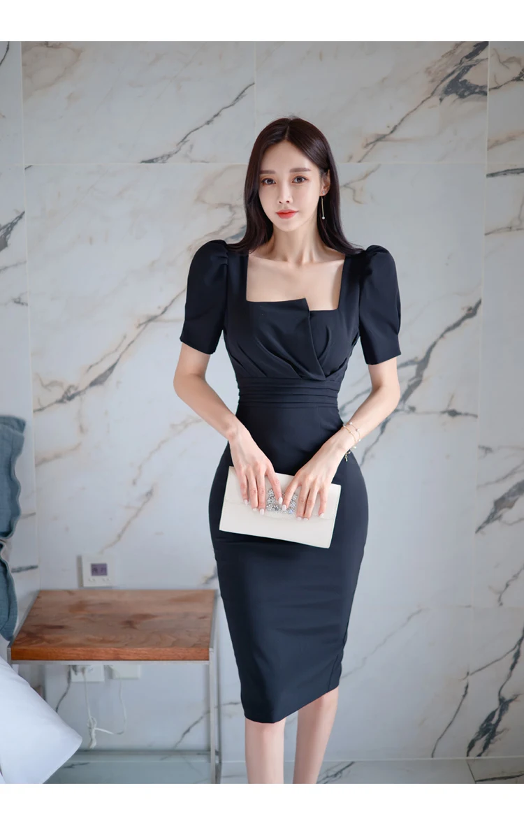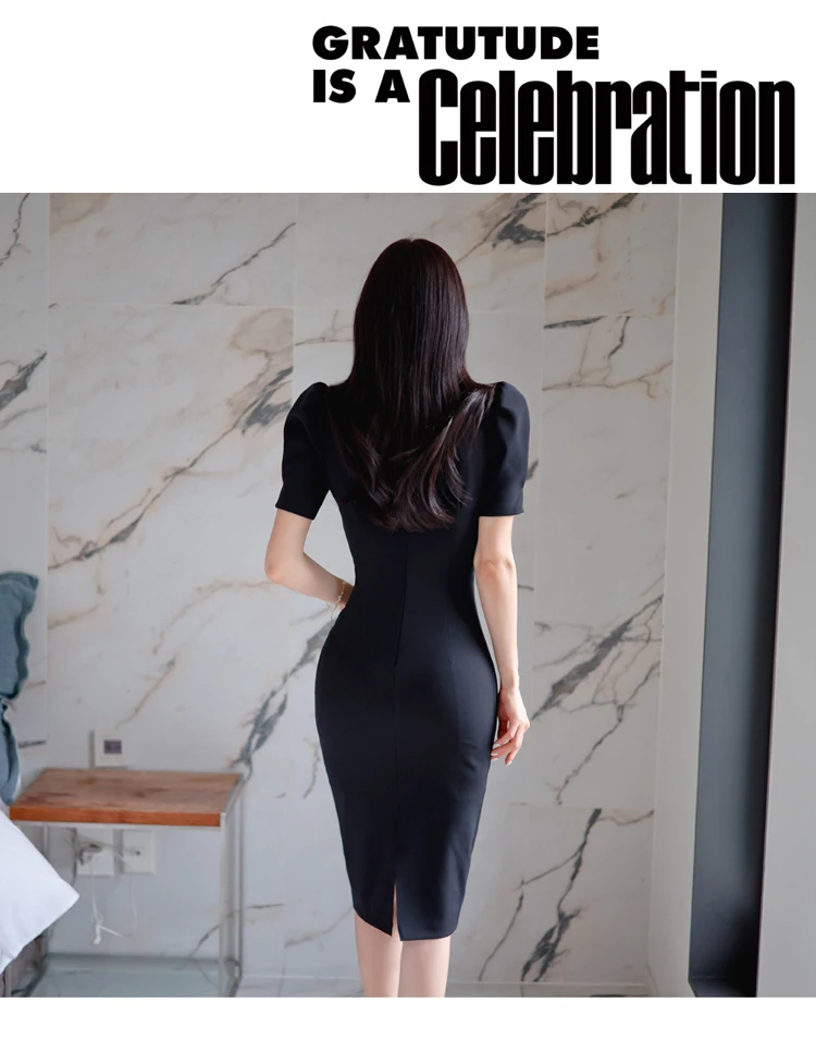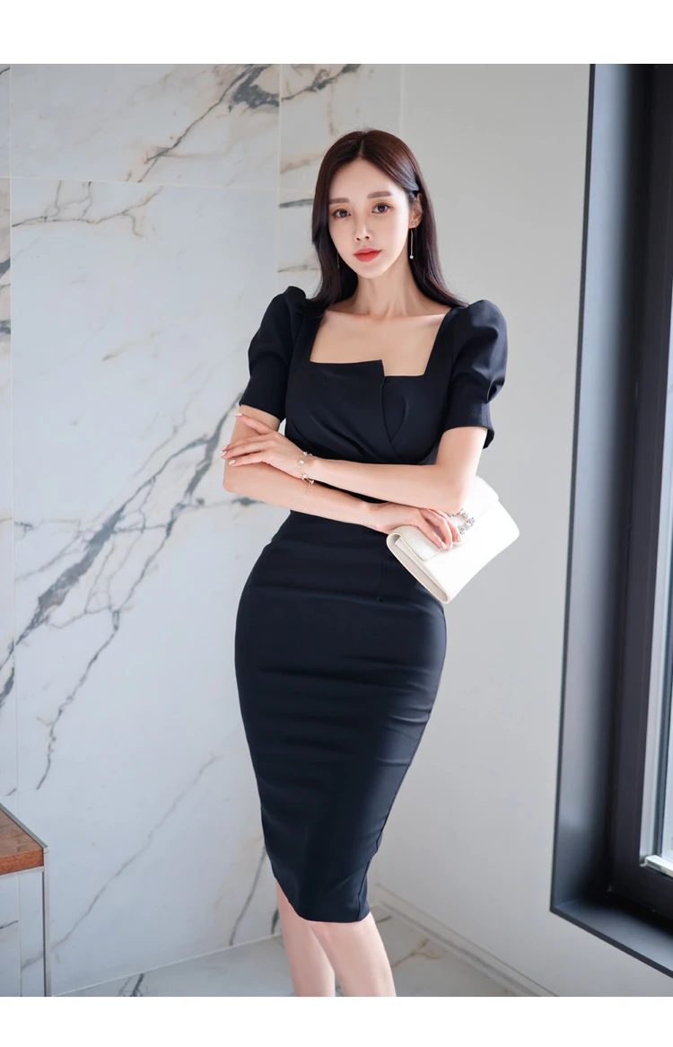 Fleepmart Formal Dress Black Puff Sleeve Square Collar Pencil Dress 2023 Fashion Elegant Slim Bodycon Office Lady Work Dress