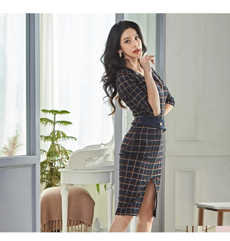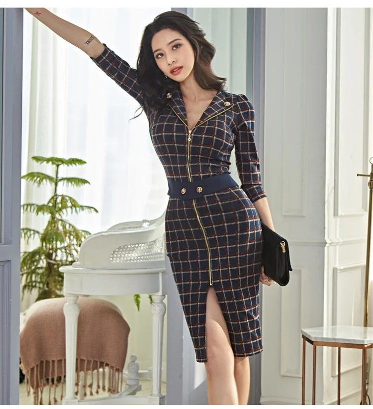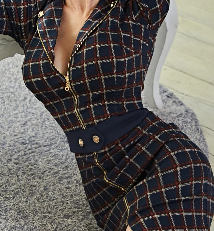 Fleepmart Formal Dress Plaid Zipper Long Sleeves V-Neck Belt Pencil Split Dress 2023 Autumn/Winter Fashion Elegant Slim Bodycon Club Dress