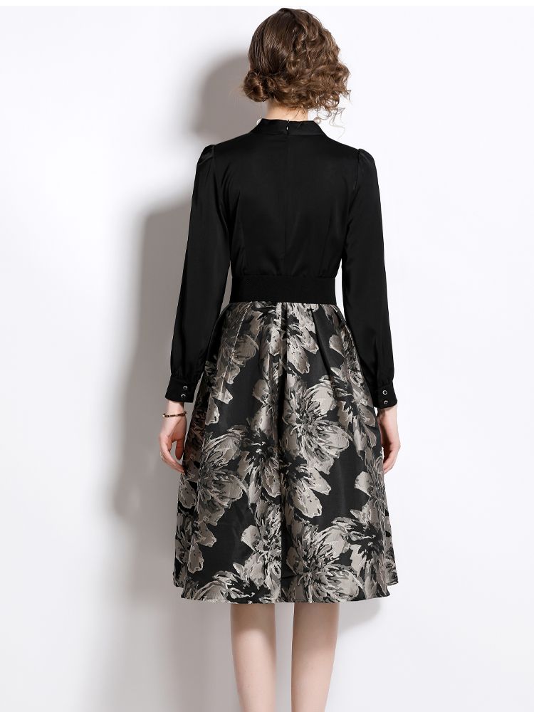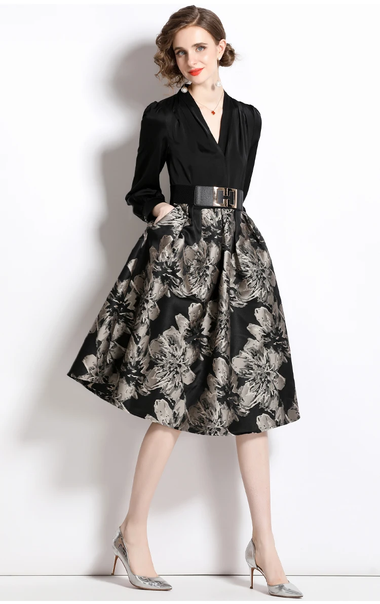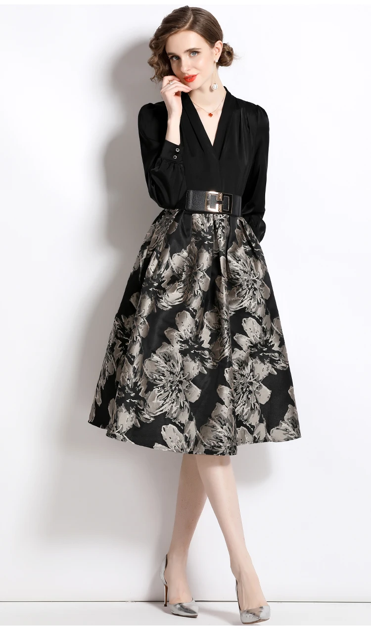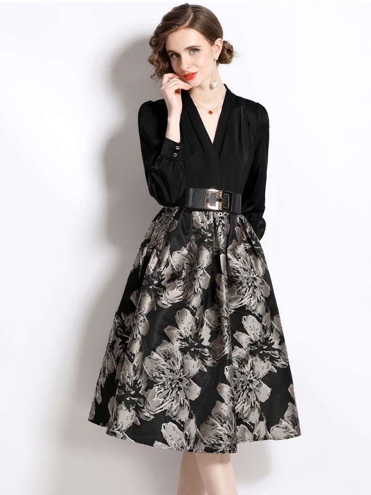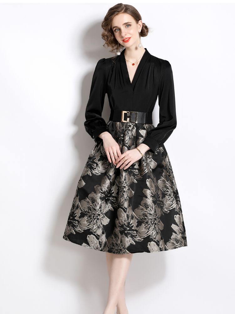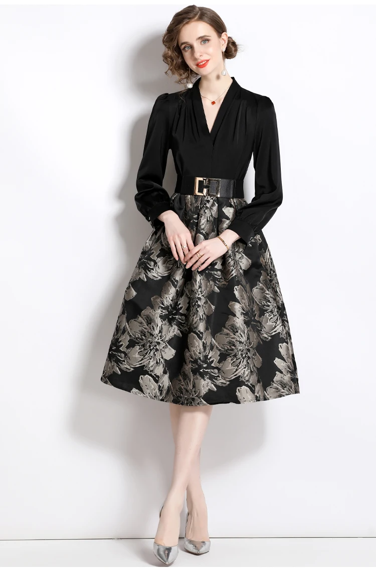 Fleepmart French Vintage Fake Two Piece Midi Dress for Women Elegant OL V-neck Long Sleeve Jacquard Slim Ball Gown Mid Dress With Belt