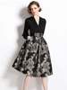 Fleepmart French Vintage Fake Two Piece Midi Dress for Women Elegant OL V-neck Long Sleeve Jacquard Slim Ball Gown Mid Dress With Belt