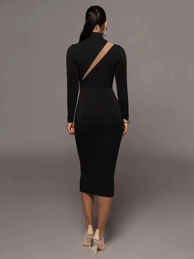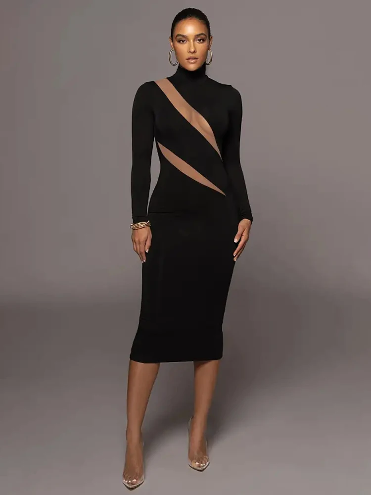 Fleepmart Gauze Splice Dress Basics Long Sleeve Bud Dresses Sexy See Through Skinny Dress Autumn And Winter Women Commuter Workwear