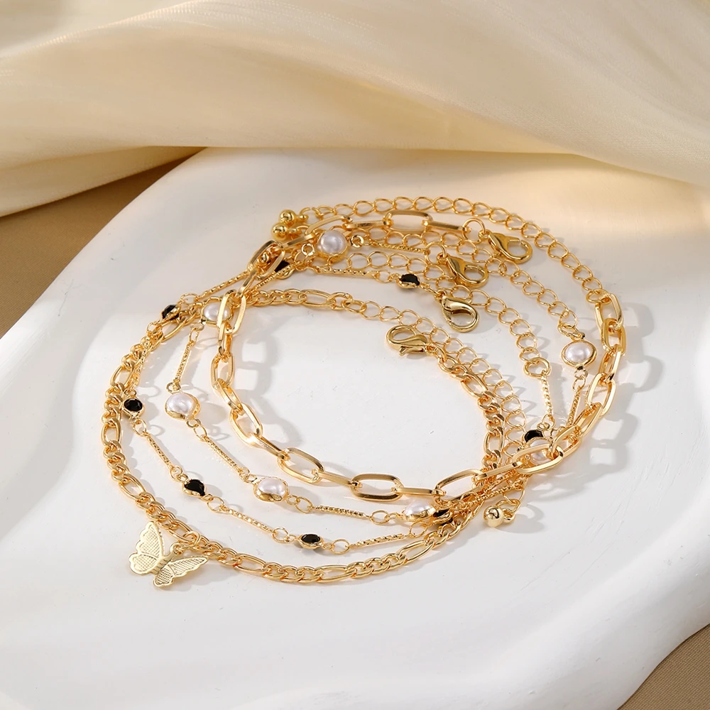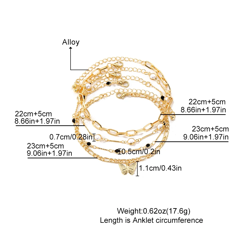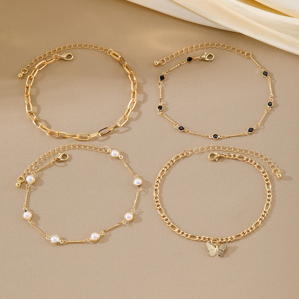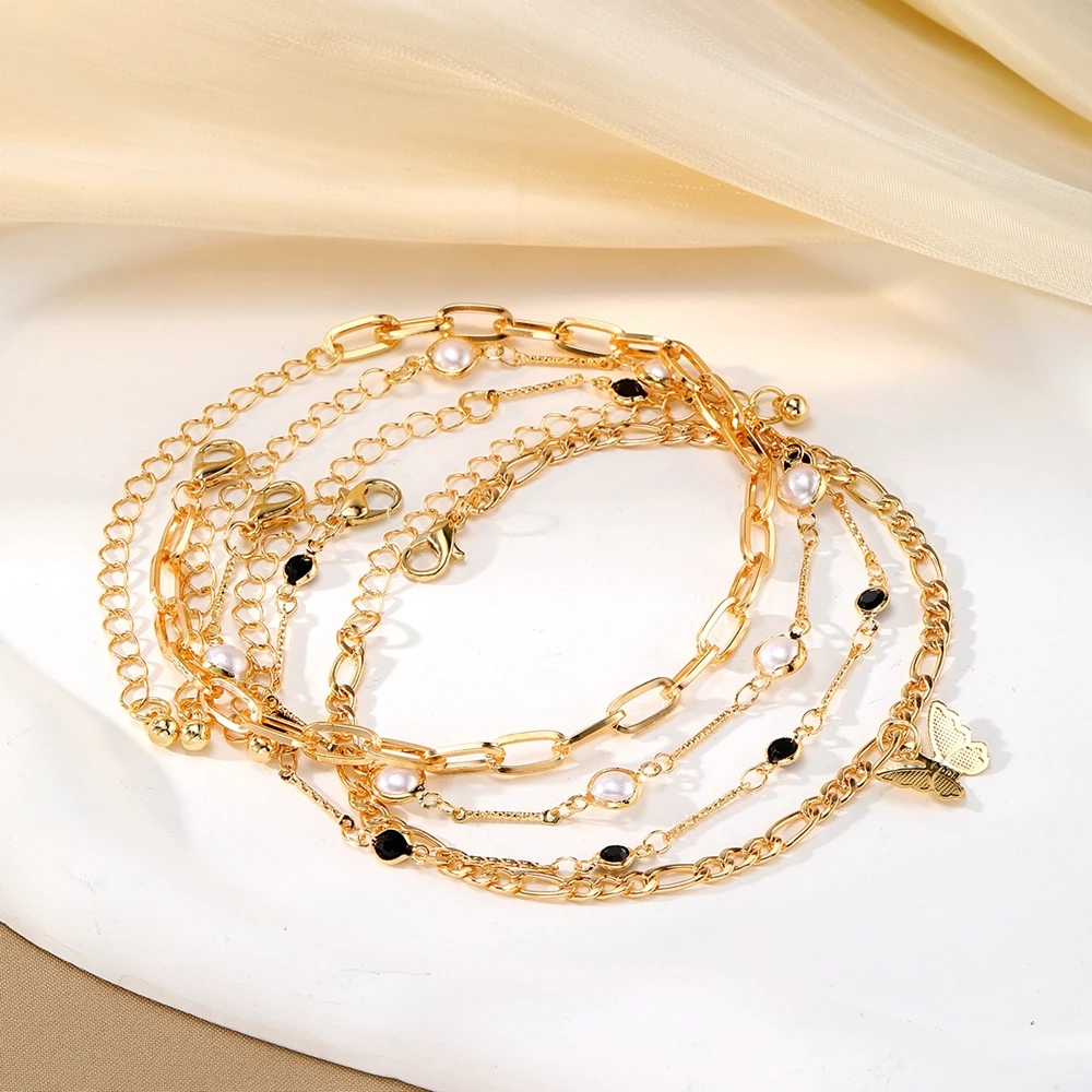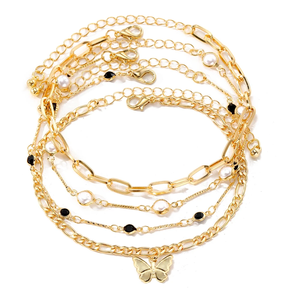 Fleepmart Gold Color 4Piece Set Anklets for Women Imitation Pearl Crystal Butterfly Pendant Chain Anklets Set Fashion Jewelry Gifts
