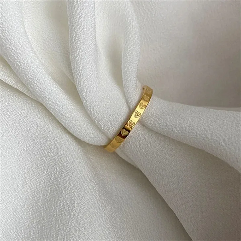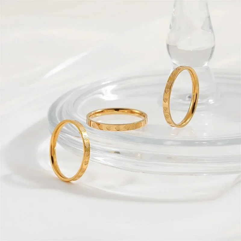 Fleepmart Golden Stainless Steel 2mm Love Heart Pattern Rings Women Thin Finger Ring Wedding Engagement Jewelry