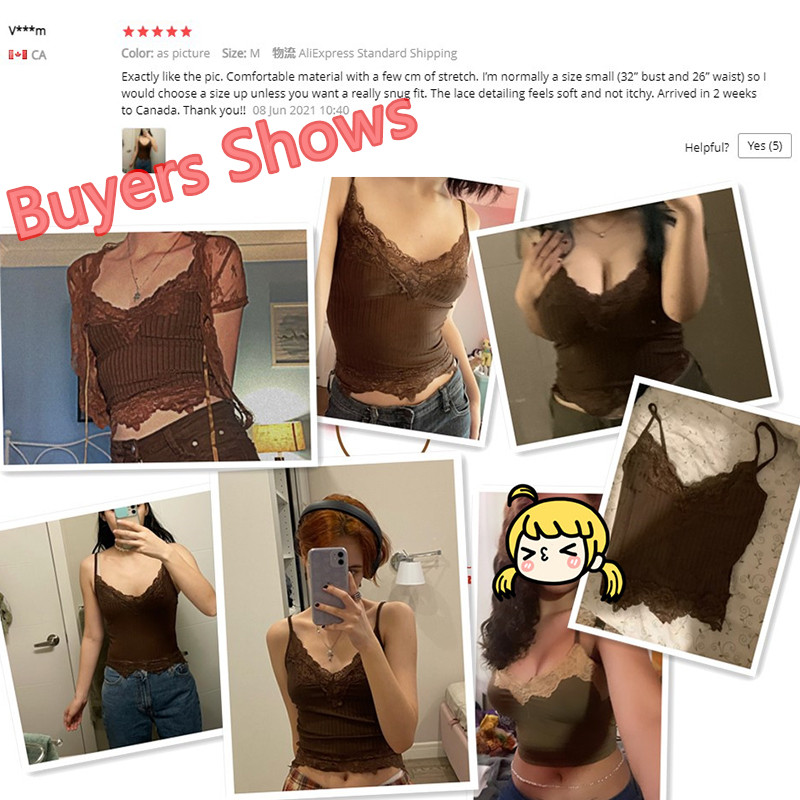 Fleepmart Goth Aesthetic Lace Patchwork Tank Tops For Women Sexy V-Neck Brown Retro Crop Tops Summer Fashion Casual Camisole