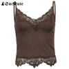 Fleepmart Goth Aesthetic Lace Patchwork Tank Tops For Women Sexy V-Neck Brown Retro Crop Tops Summer Fashion Casual Camisole