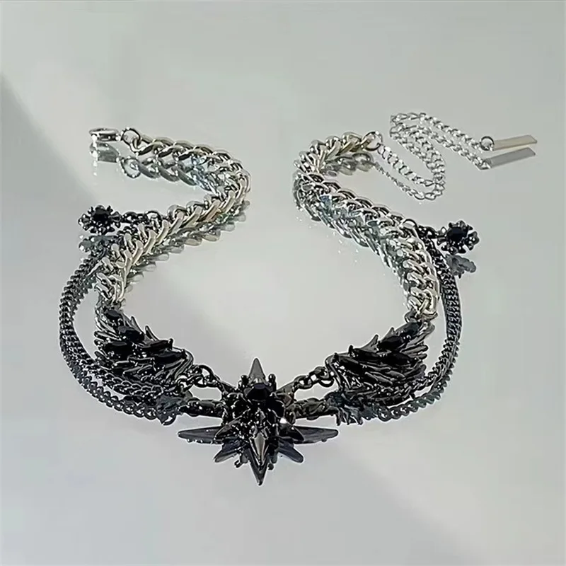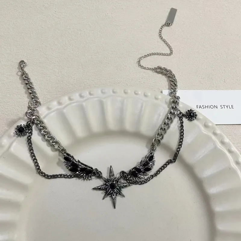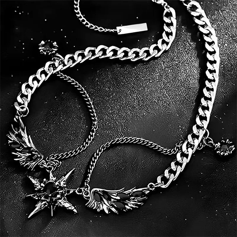 Fleepmart Gothic Demon Wings Black Heart Pendant Necklace For Women Unique Silver Color Star Neck Chain Halloween Jewelry Gifts