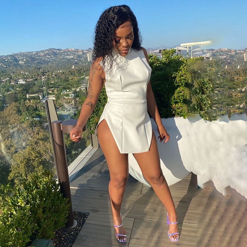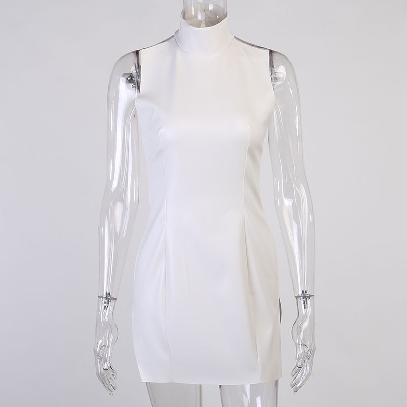 Fleepmart Gothic Women Bodycon Dress PU Leather Summer Vestido High Waist Sleeveless Sexy Slit Mini Dress Women Mock Neck Clothing