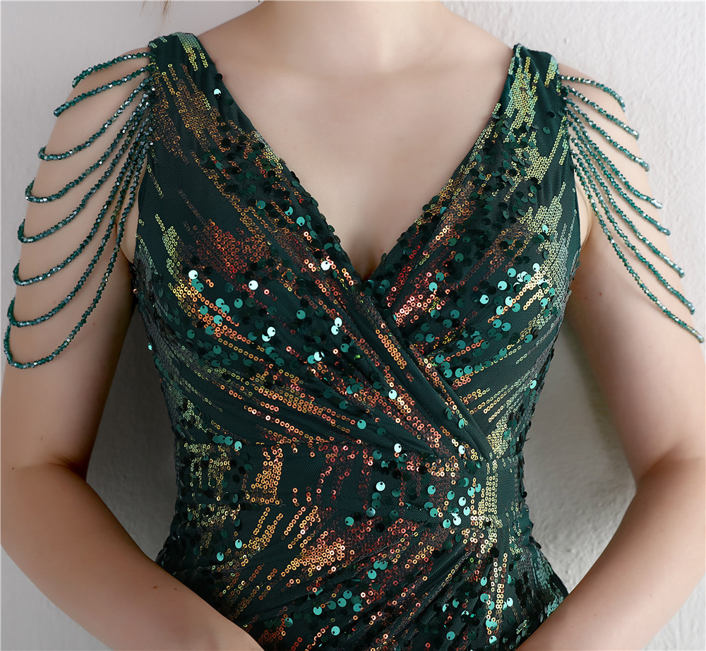 Fleepmart Green Sequin V Neck Beading Evening Dress Sexy Slit Party Maxi Dress Women Long Prom Dress