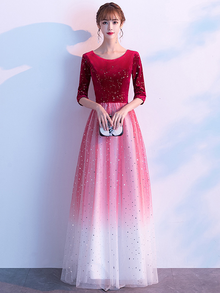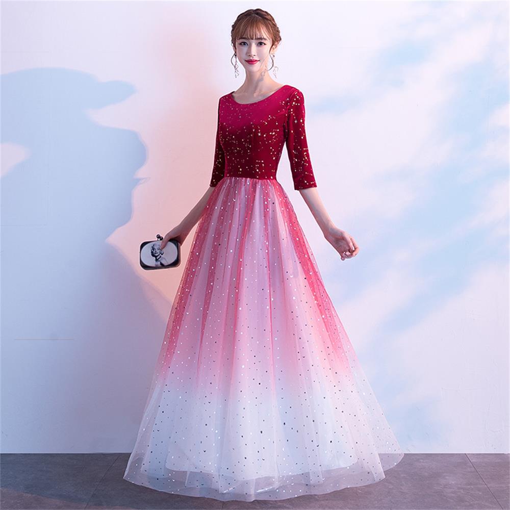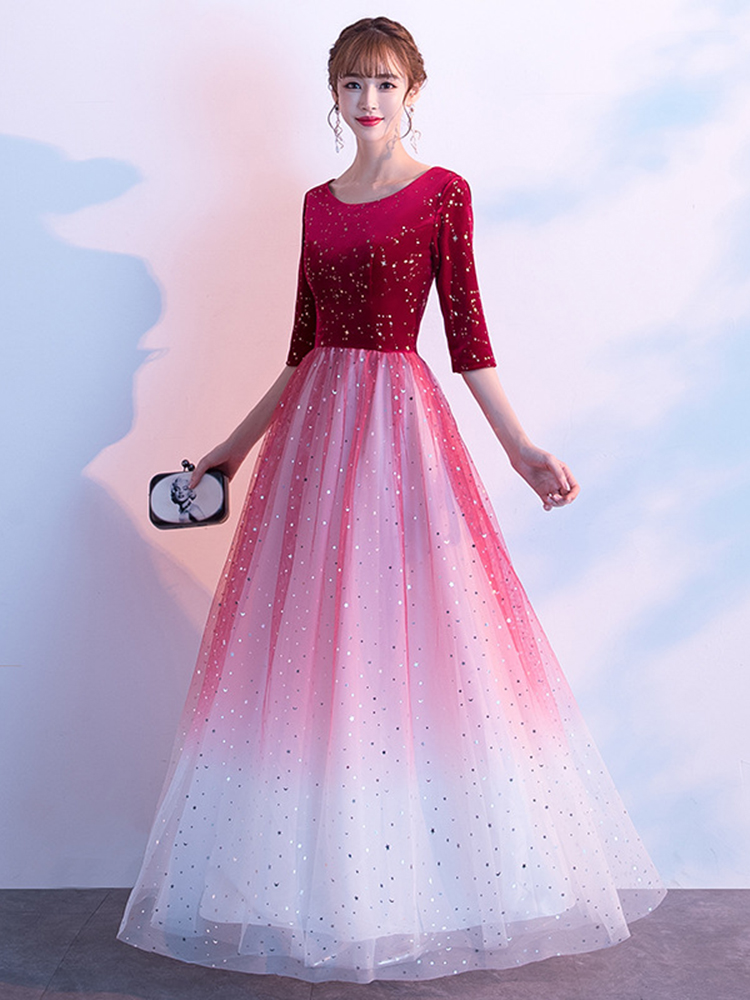 Fleepmart Hafe Sleeve Formal Dress A-Line Evening Dress O-Neck Tull Long Party Dress