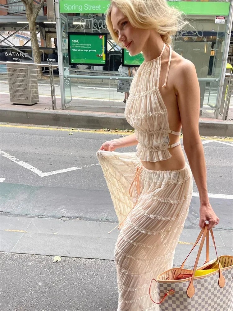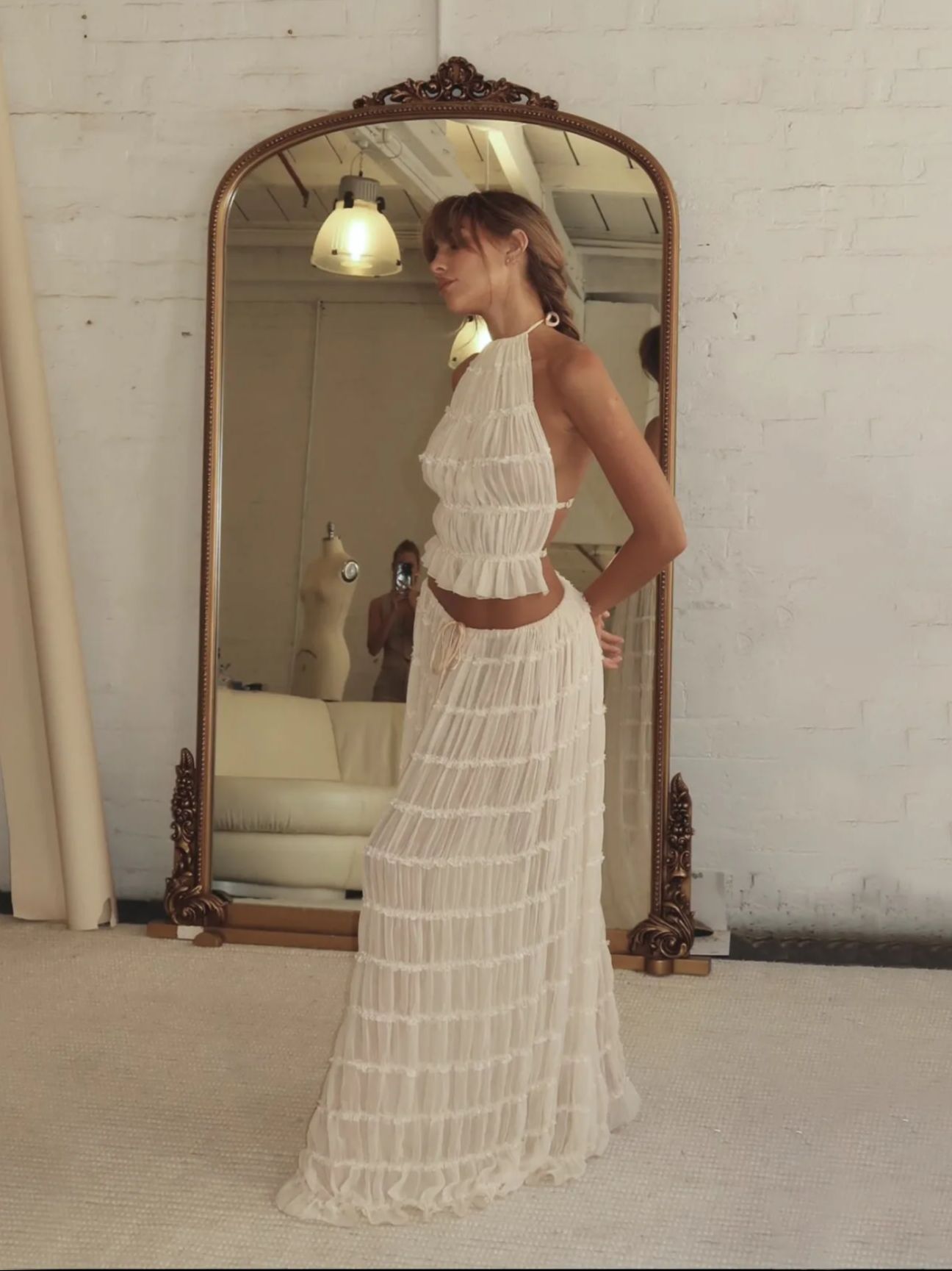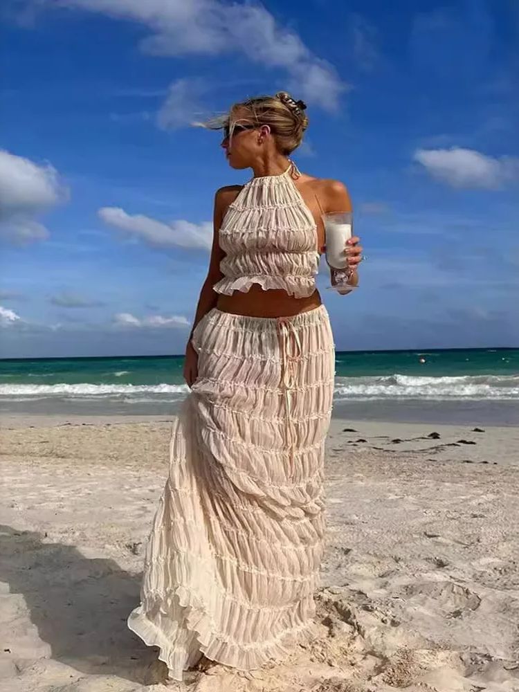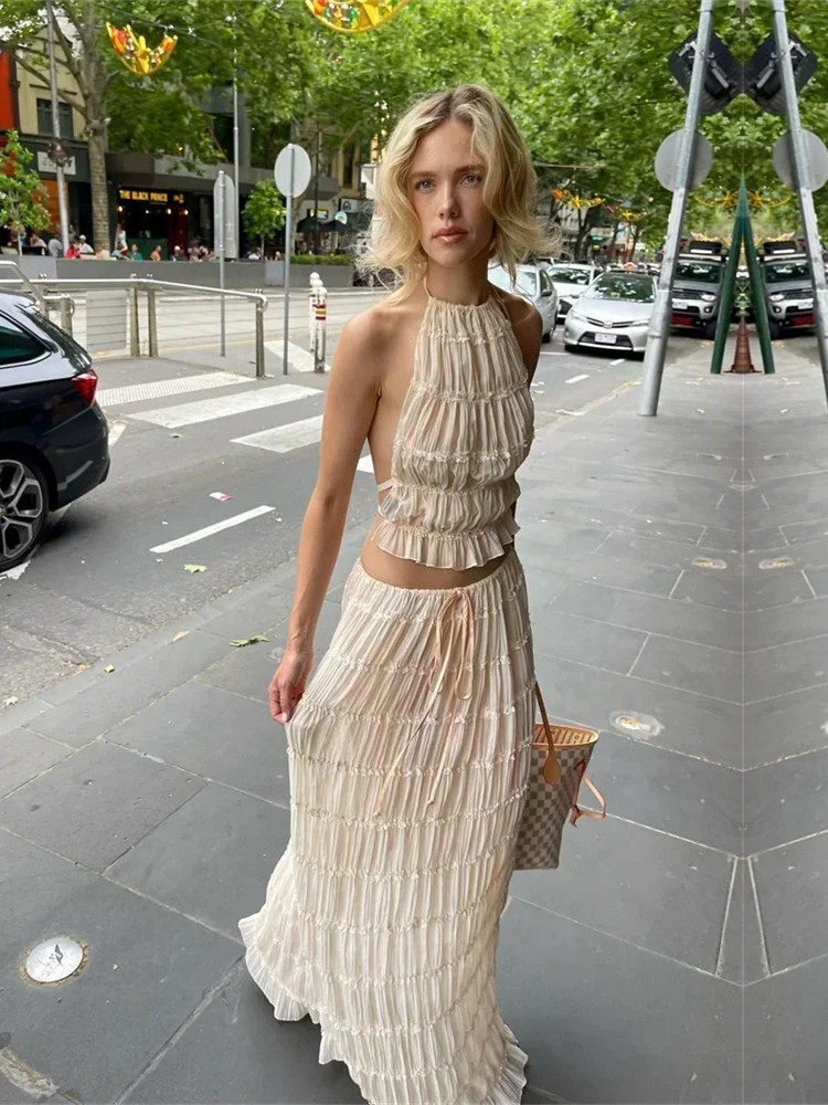 Fleepmart Halter Neck Long Skirt Suit Women Summer Party Beach Backless Sling Top + Lace Up Fold Maxi Skirts 2 Piece Set Female Outfits