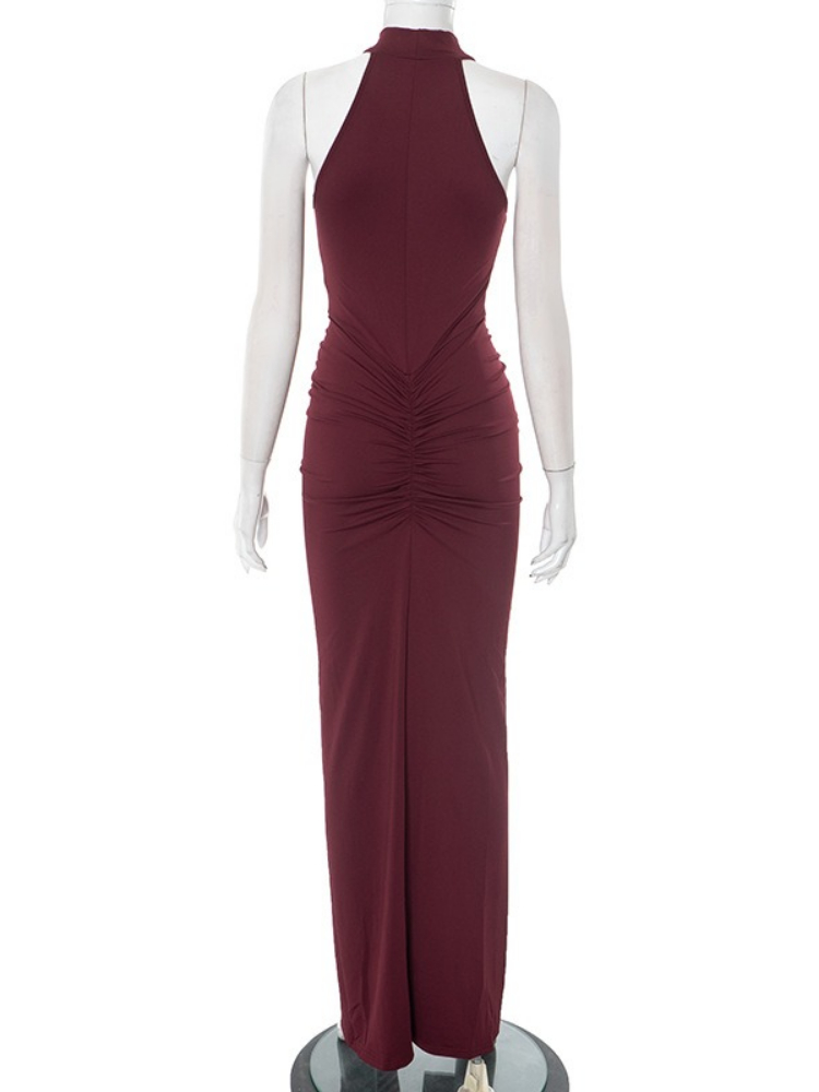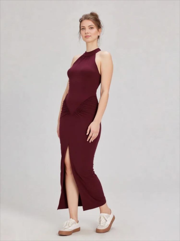 Fleepmart Halter Ruched Sexy Maxi Dresses for Women Gown Fashion Sleeveless Slim High Waist Evening Club Party Split Long Dress
