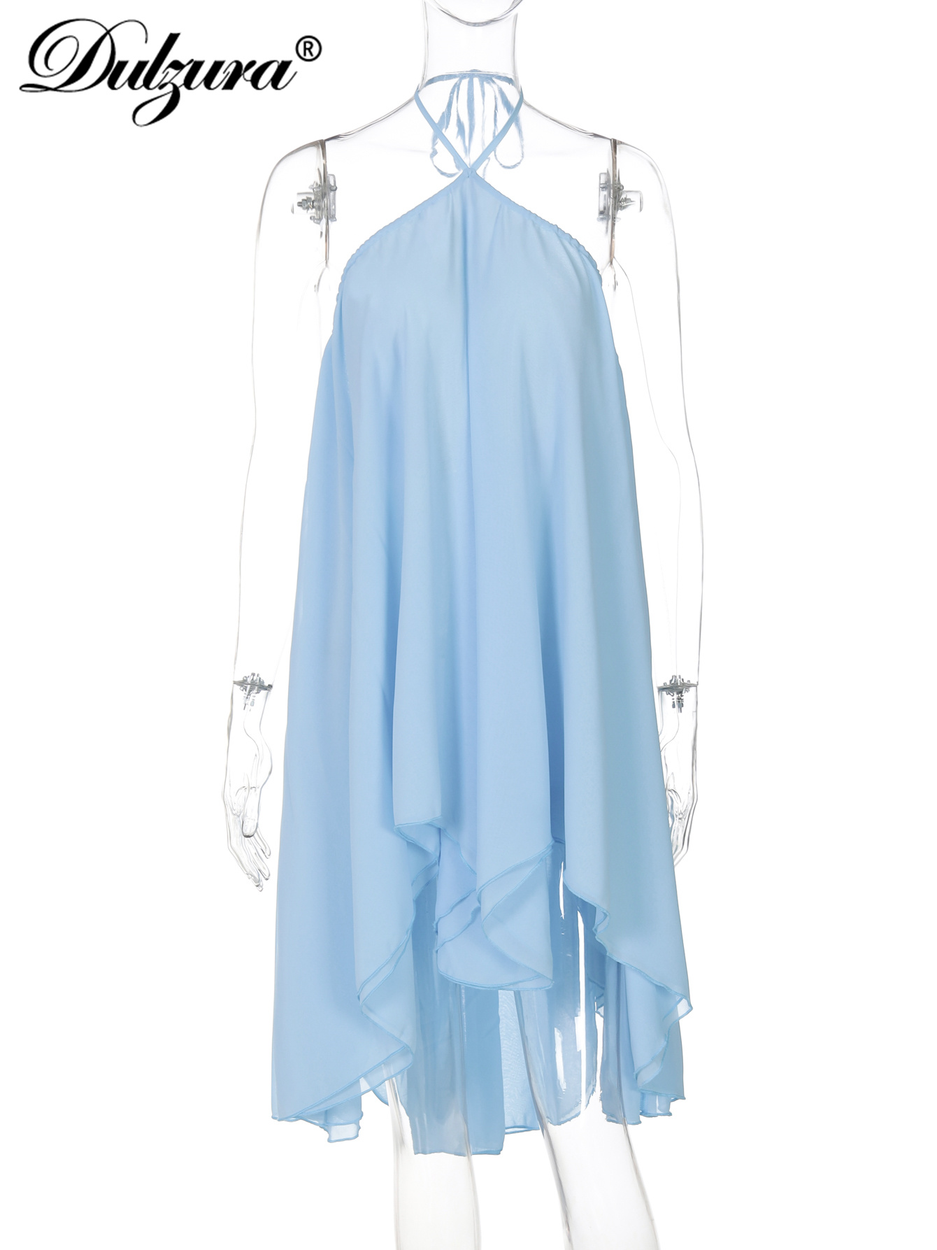 Fleepmart Halter Sleeveless Slim Fit Lace Up Irregular Chiffon Pleated Mini Dress Solid Sexy Casual Dress Party Club Summer Outfit