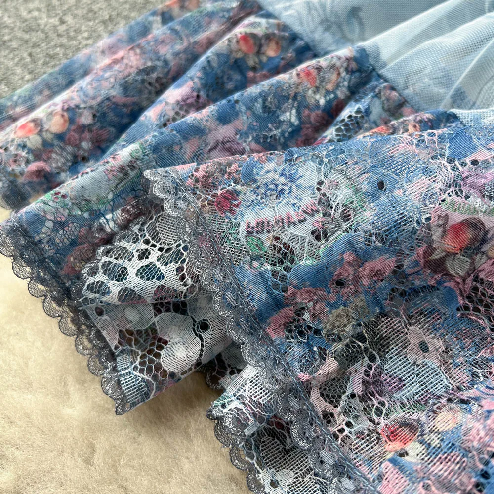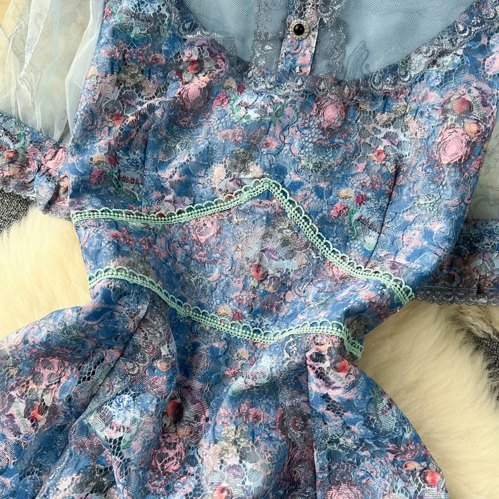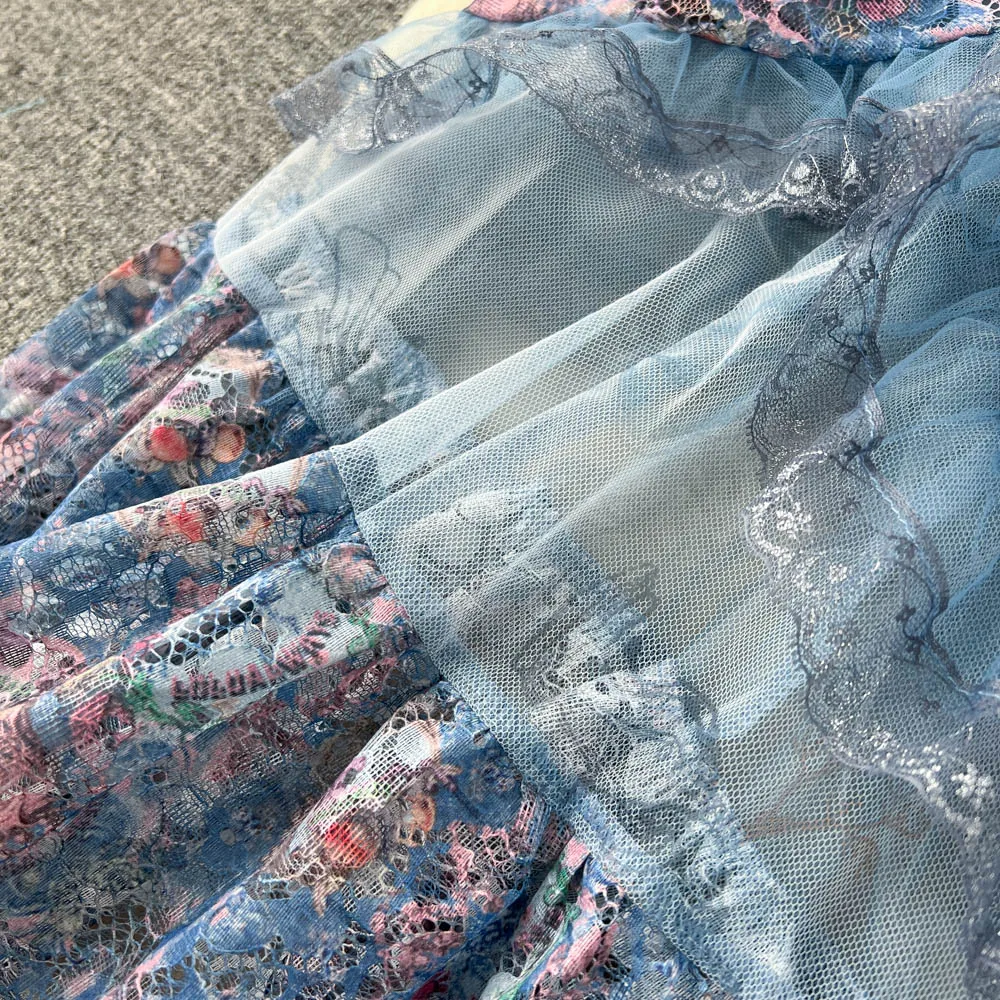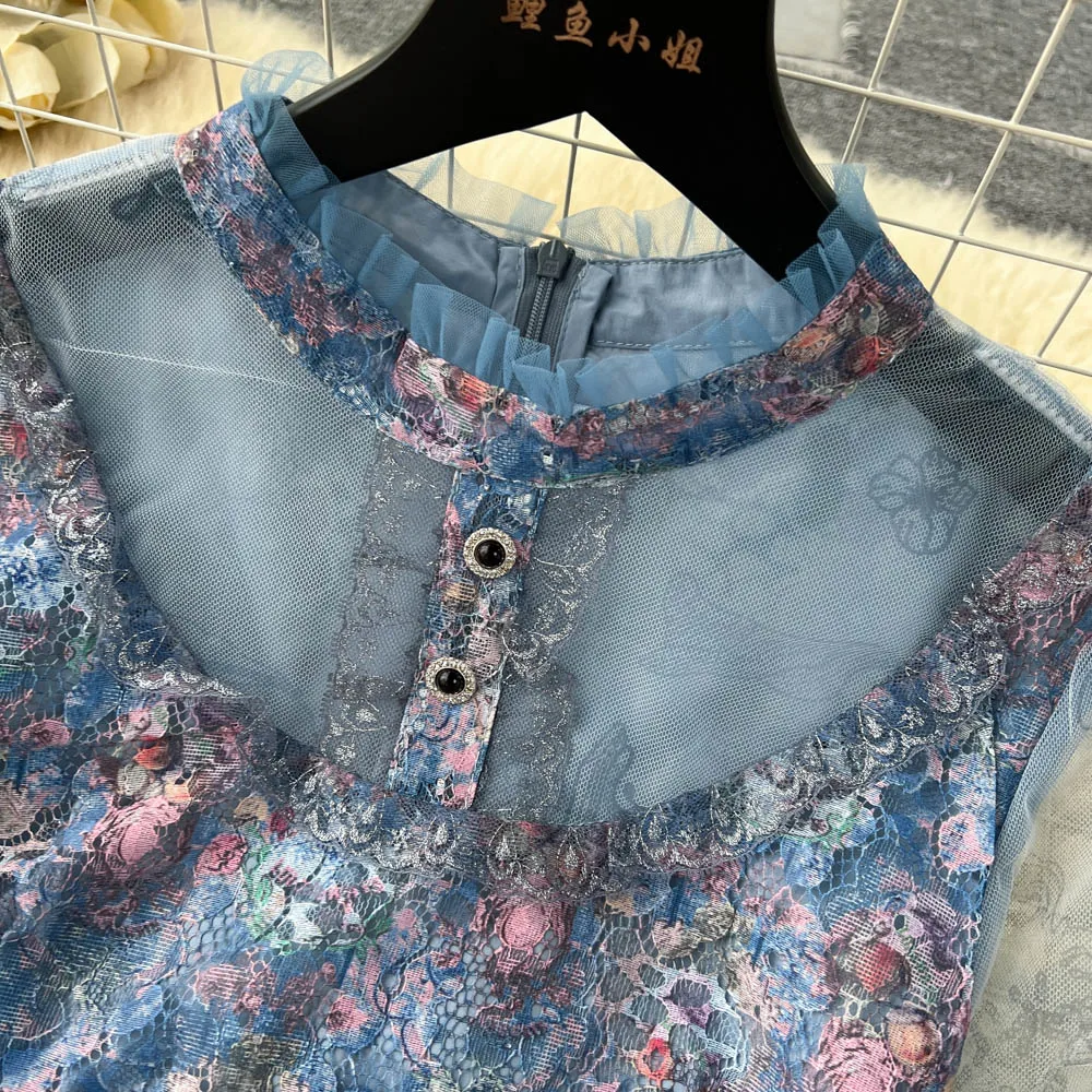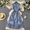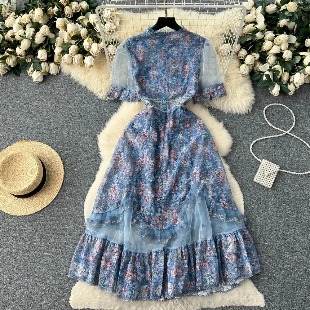 Fleepmart High Quality Elegant Summer Midi Dress Women Short Sleeve Mesh Printed Ruffled Beach Holiday Slim Party Vestidos Robes