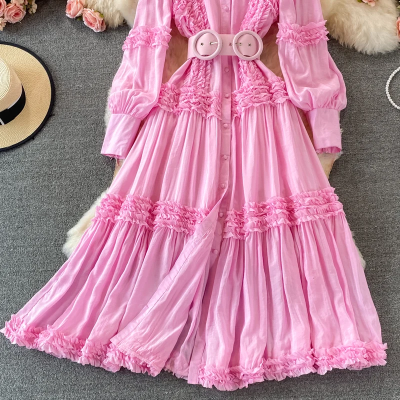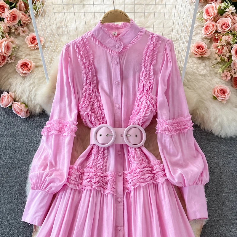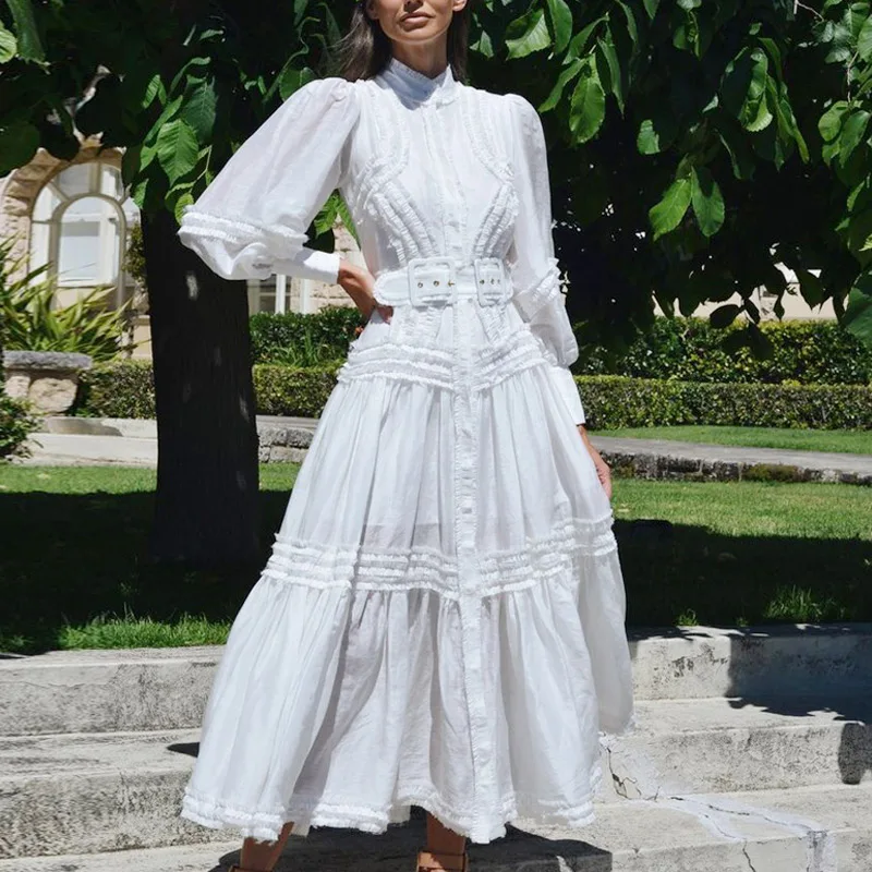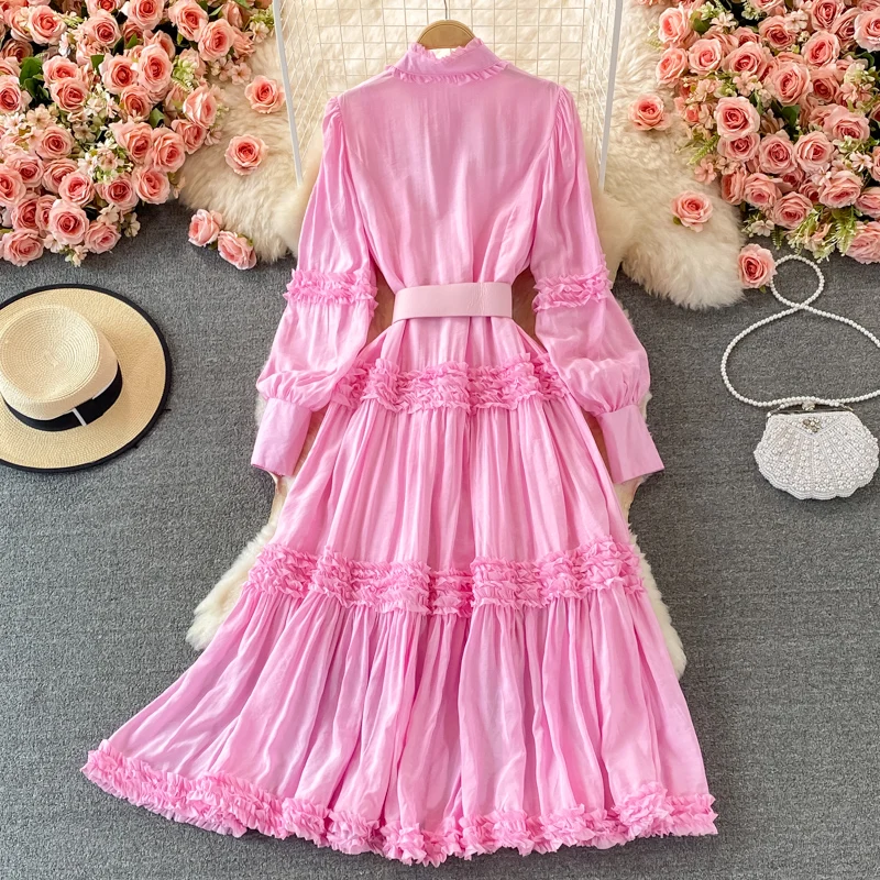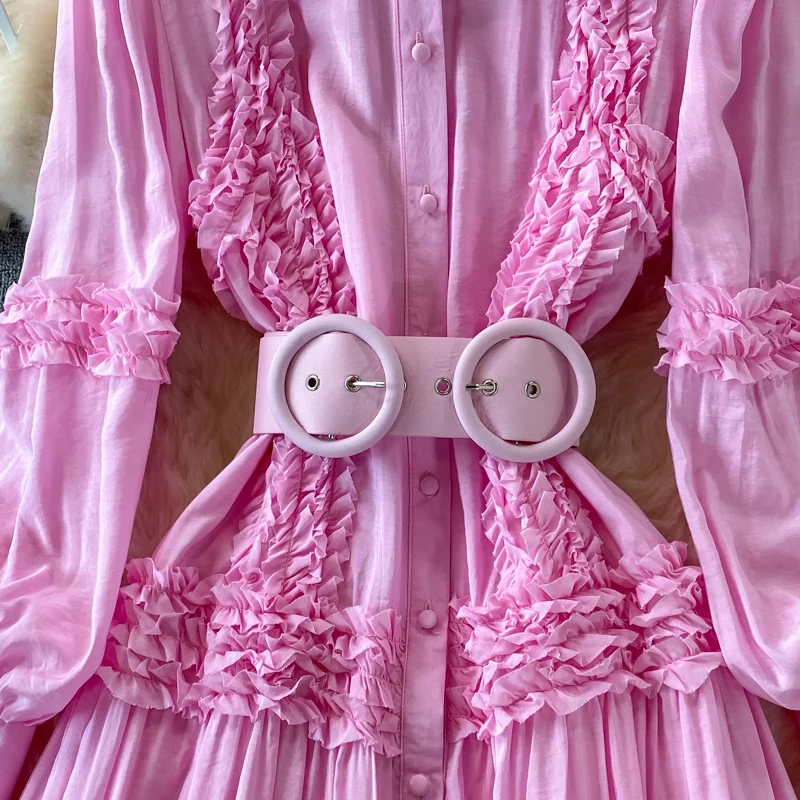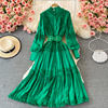 fleepmart High Quality Runway Autumn Green Ruffles Long Dress Women Stand Collar Lantern Sleeve Female Belted Holiday Party Dresses