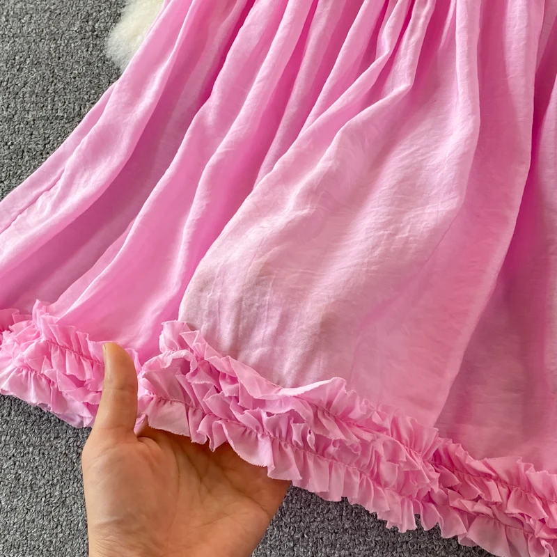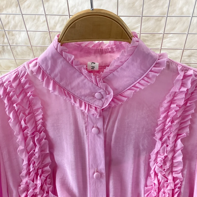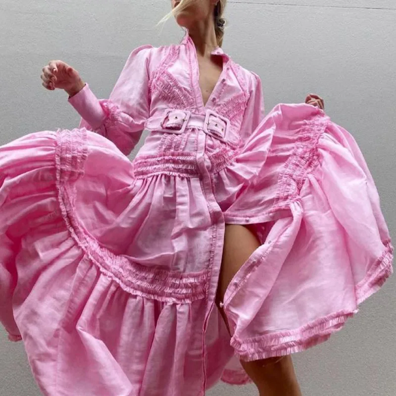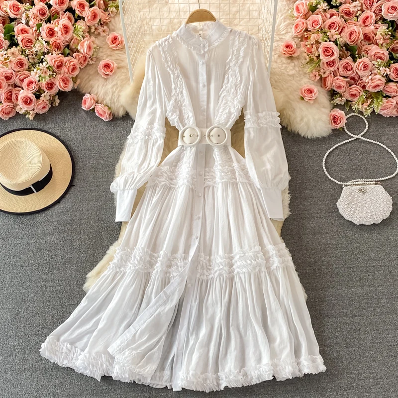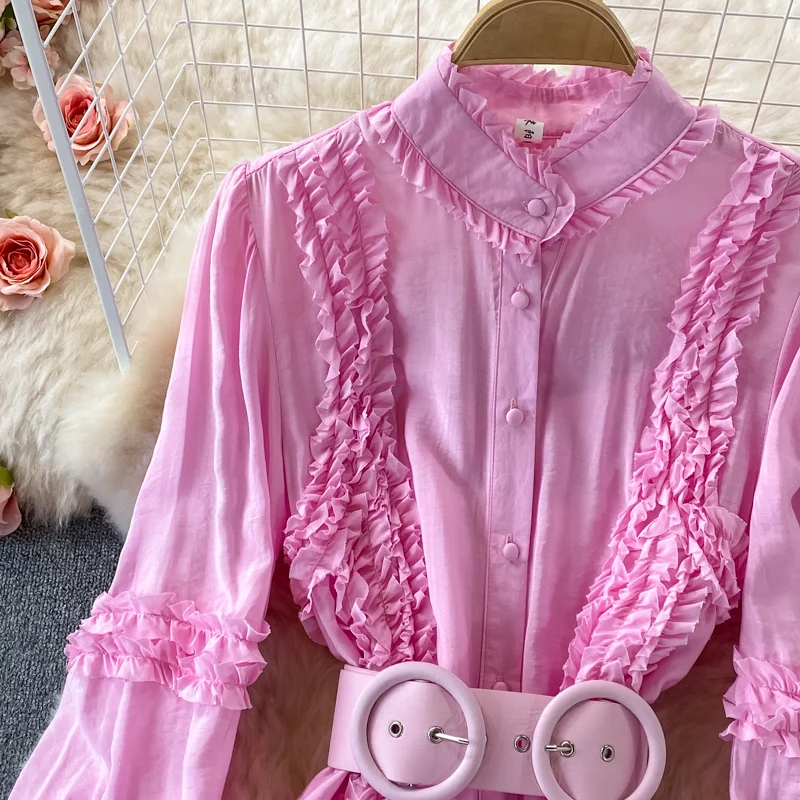 fleepmart High Quality Runway Autumn Green Ruffles Long Dress Women Stand Collar Lantern Sleeve Female Belted Holiday Party Dresses