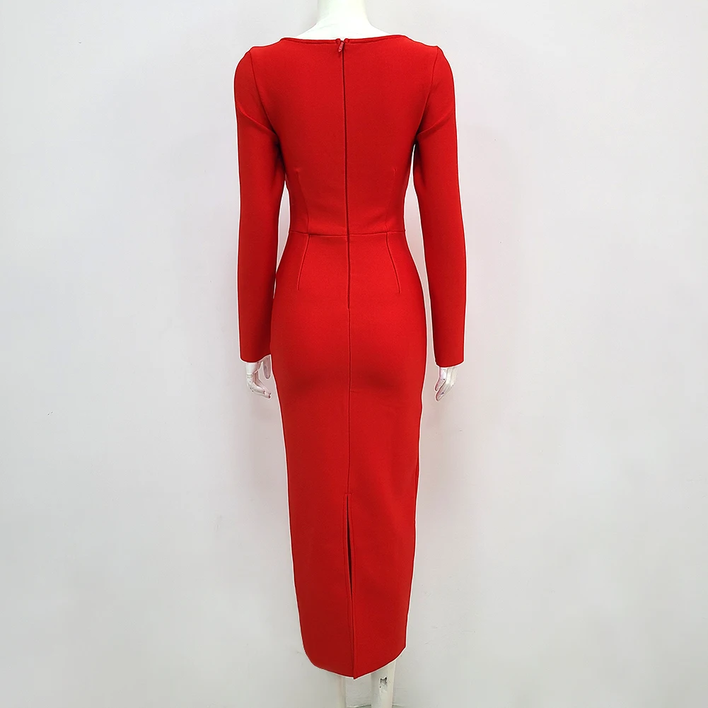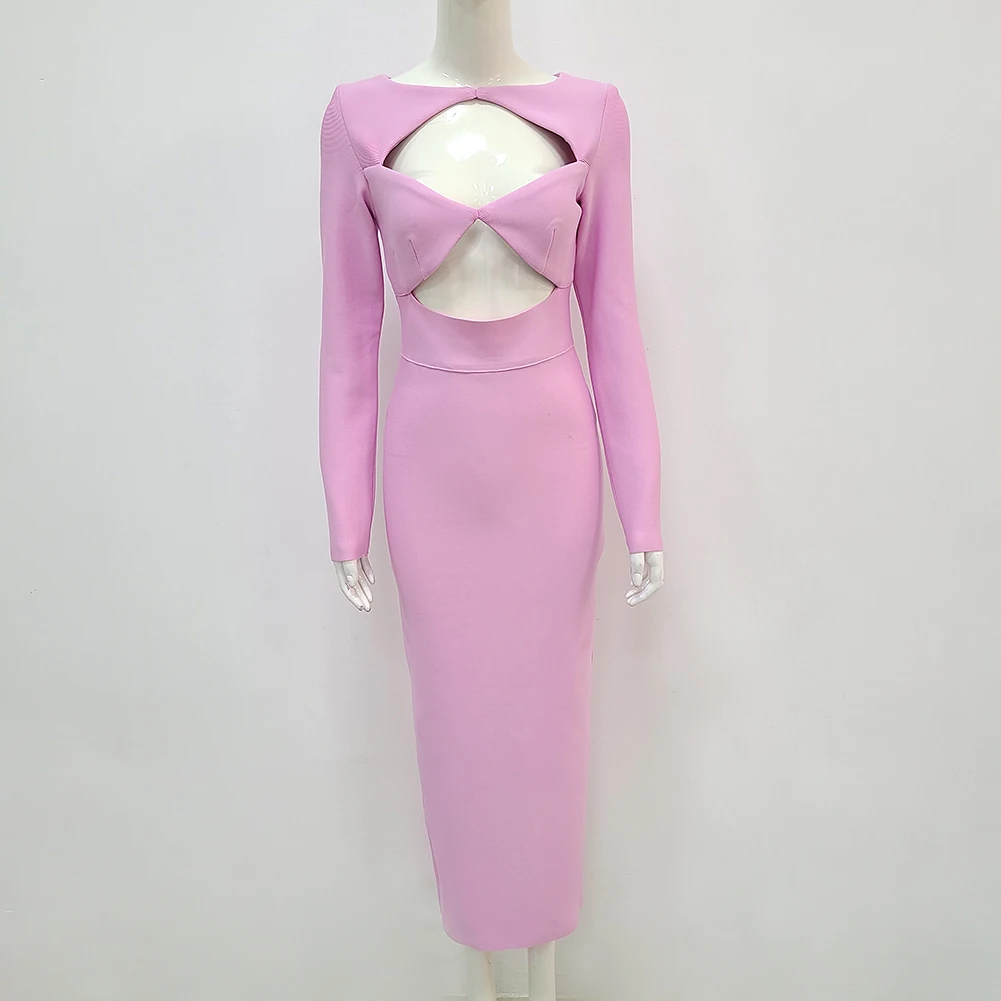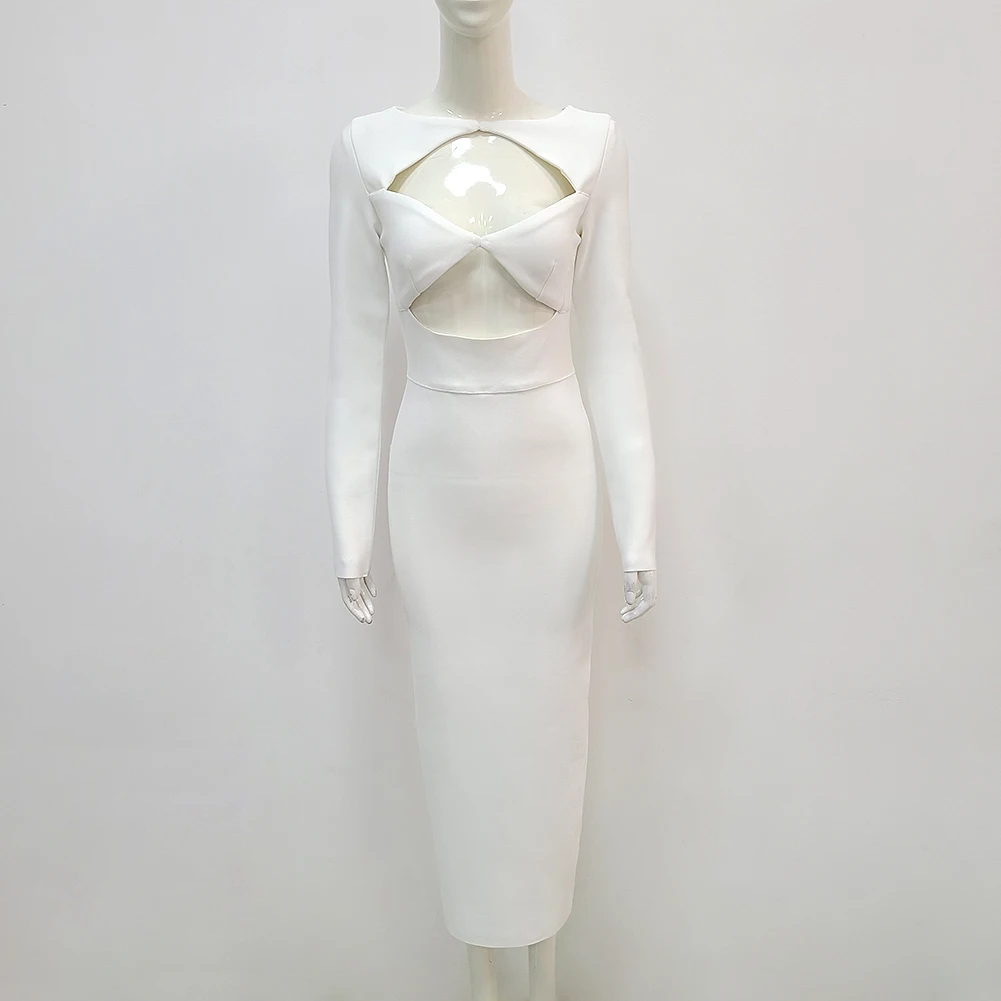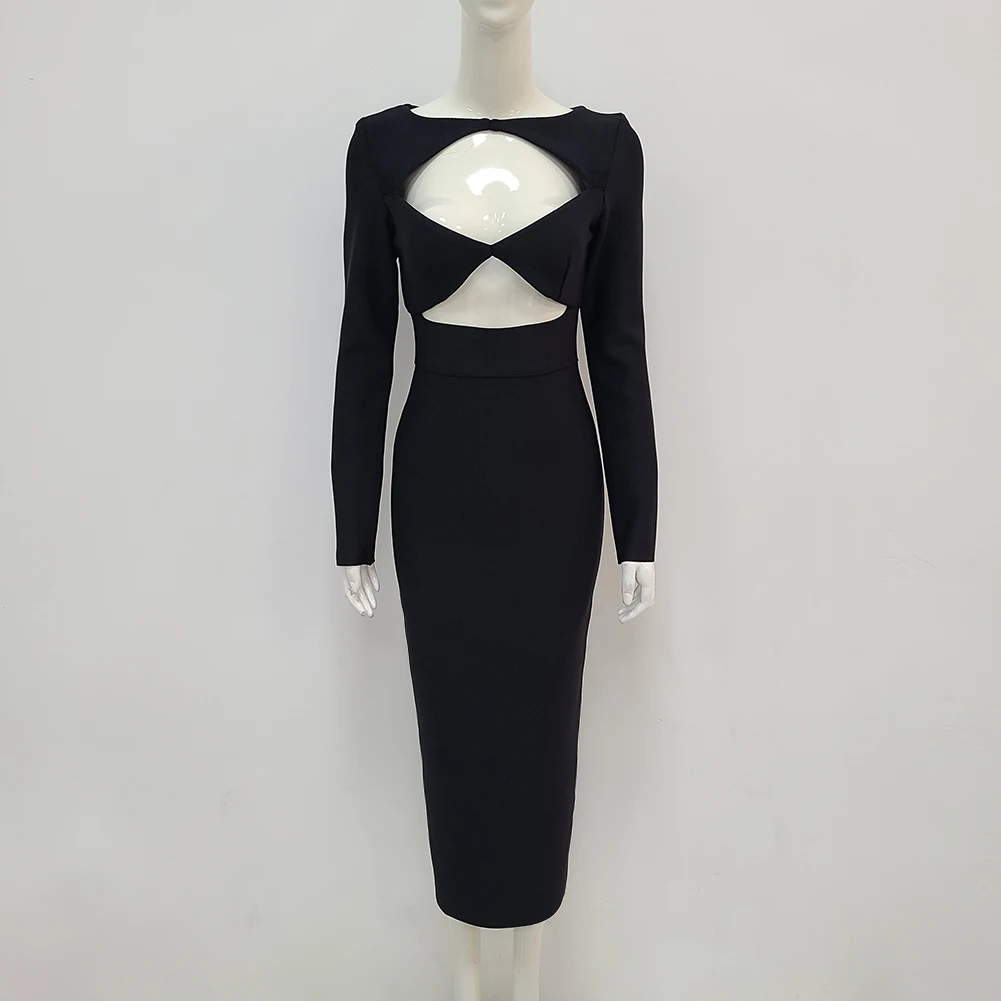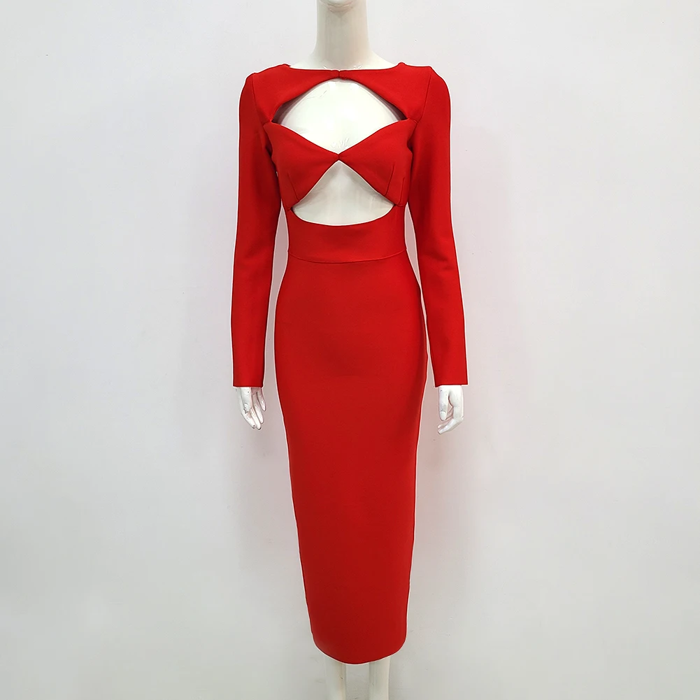 Fleepmart High Quality Women Long Sleeve Sexy Holes Bodycon Mid-calf Dress Rayon Bandage Fashion Celebrate Evening Party Dress