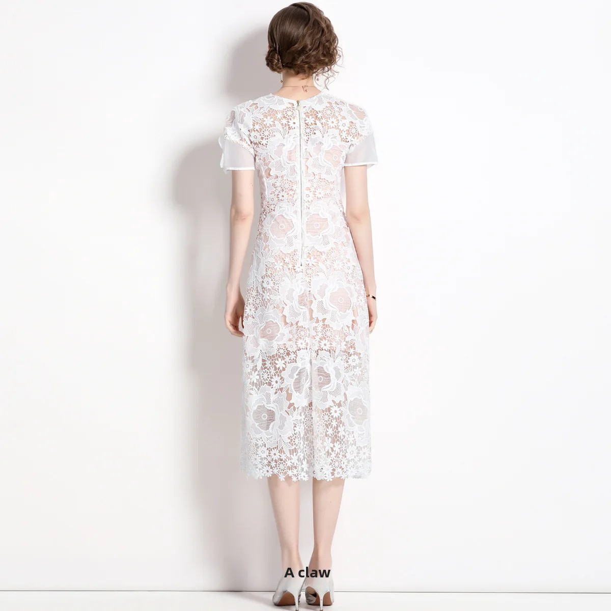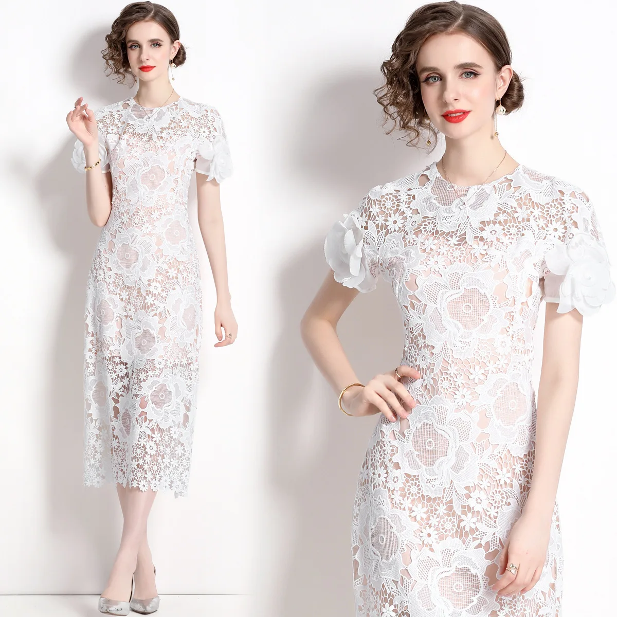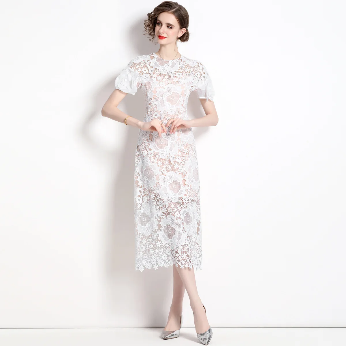 Fleepmart Summer New Nicheshort Sleeves Heavy Duty Puff Sleevelace Hollow Out Long Dress Slims You And Smooths Your Silhouette Gown Dress