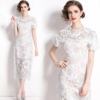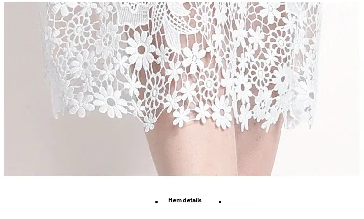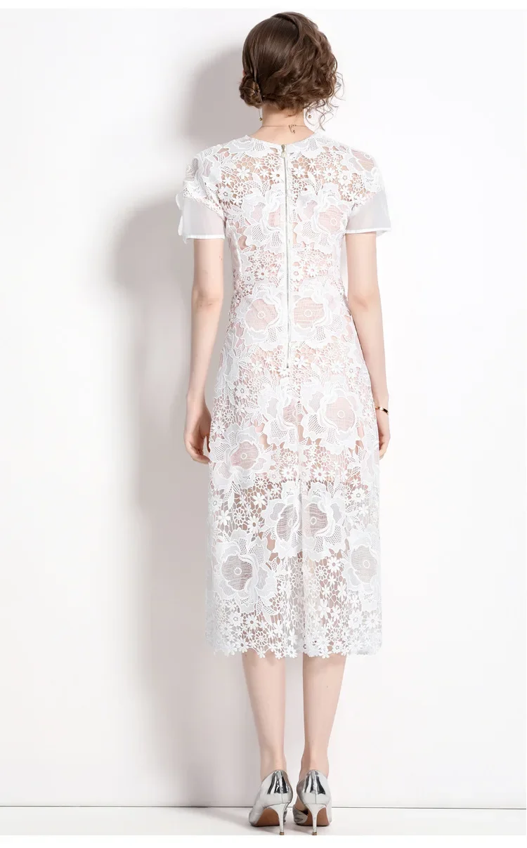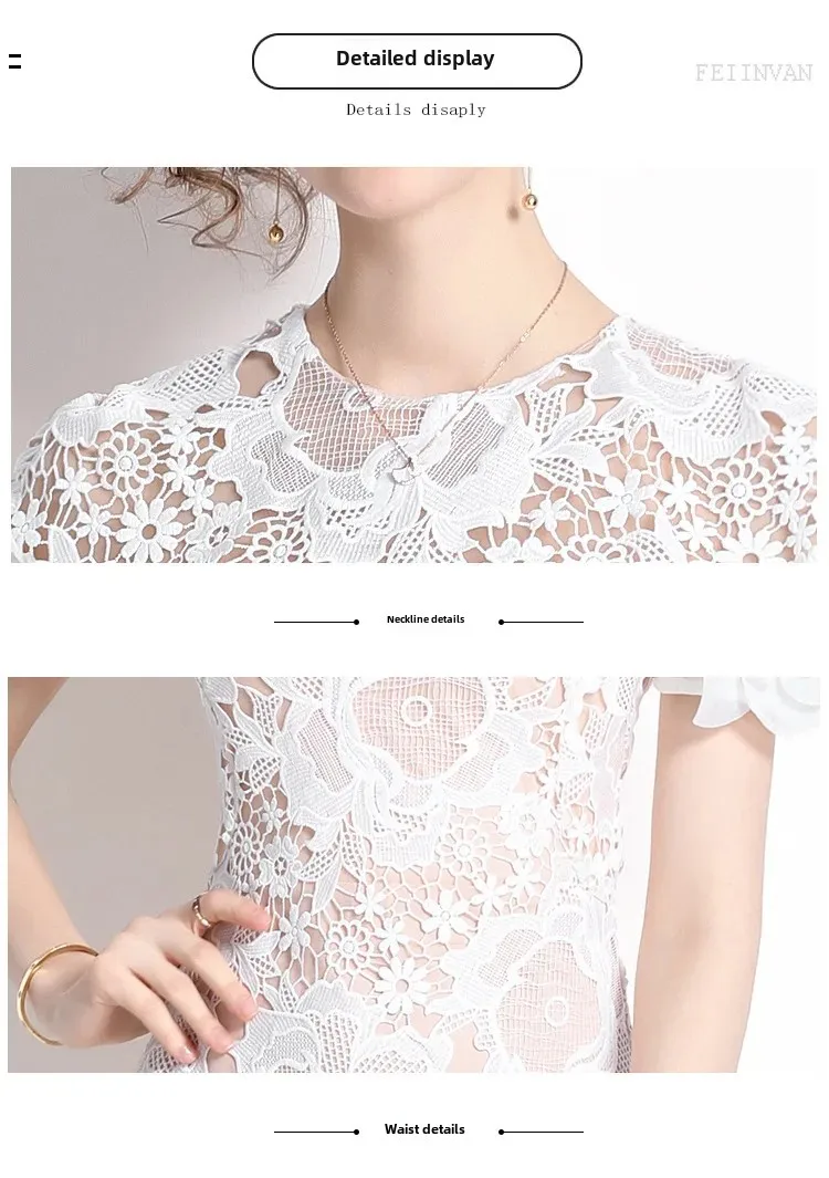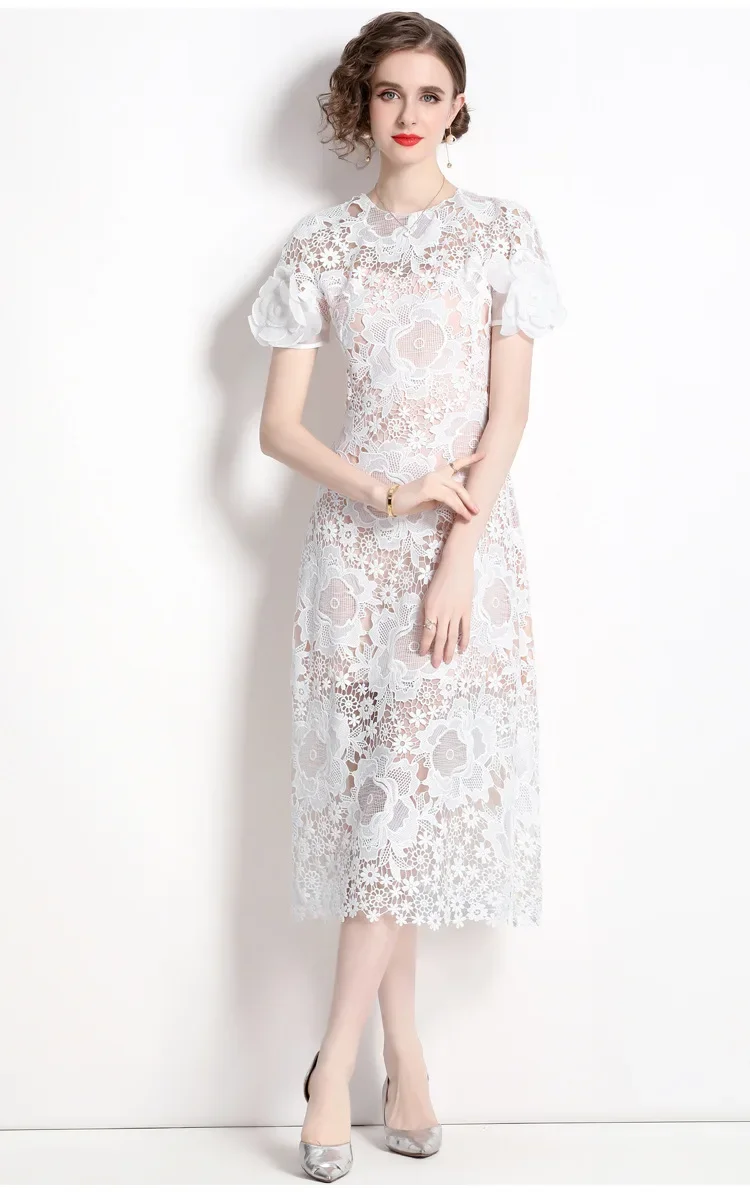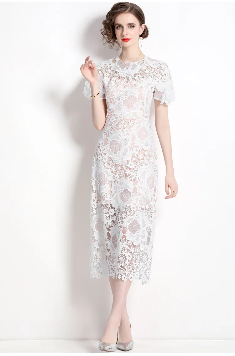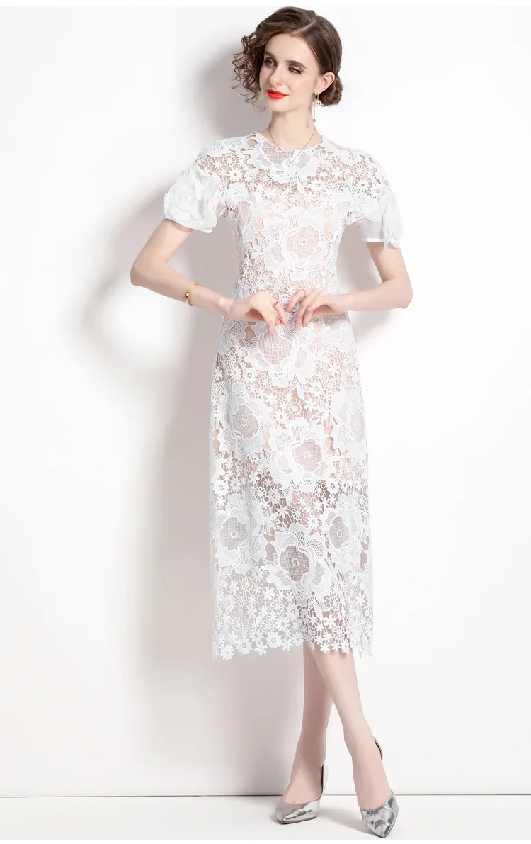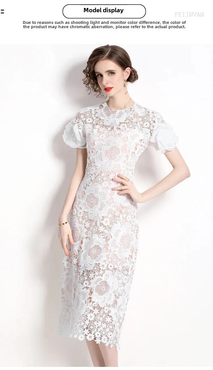 Fleepmart Summer New Nicheshort Sleeves Heavy Duty Puff Sleevelace Hollow Out Long Dress Slims You And Smooths Your Silhouette Gown Dress