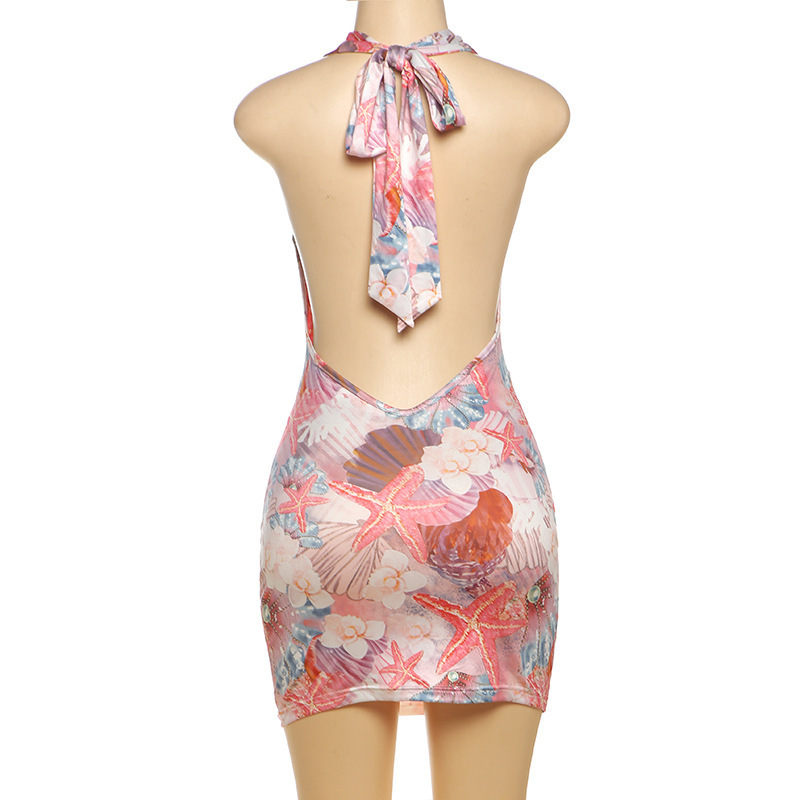 Fleepmart Hollow Halter Printed Dress Women Vacation Mini 2025 Summer Dress Deep V Bandage Backless Sexy Party Dresses Vestidos