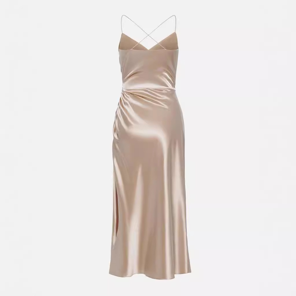 Fleepmart Hot Girls Satin Spaghetti Strap Long Dresses Women Sexy V-neck Fold Slim Slit Dress Fashion Trendy Party Banquet Club Vestidos