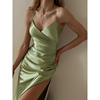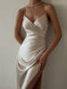 Fleepmart Hot Girls Satin Spaghetti Strap Long Dresses Women Sexy V-neck Fold Slim Slit Dress Fashion Trendy Party Banquet Club Vestidos