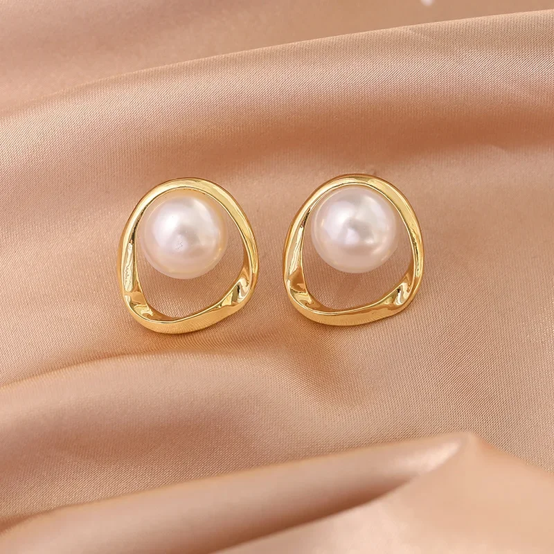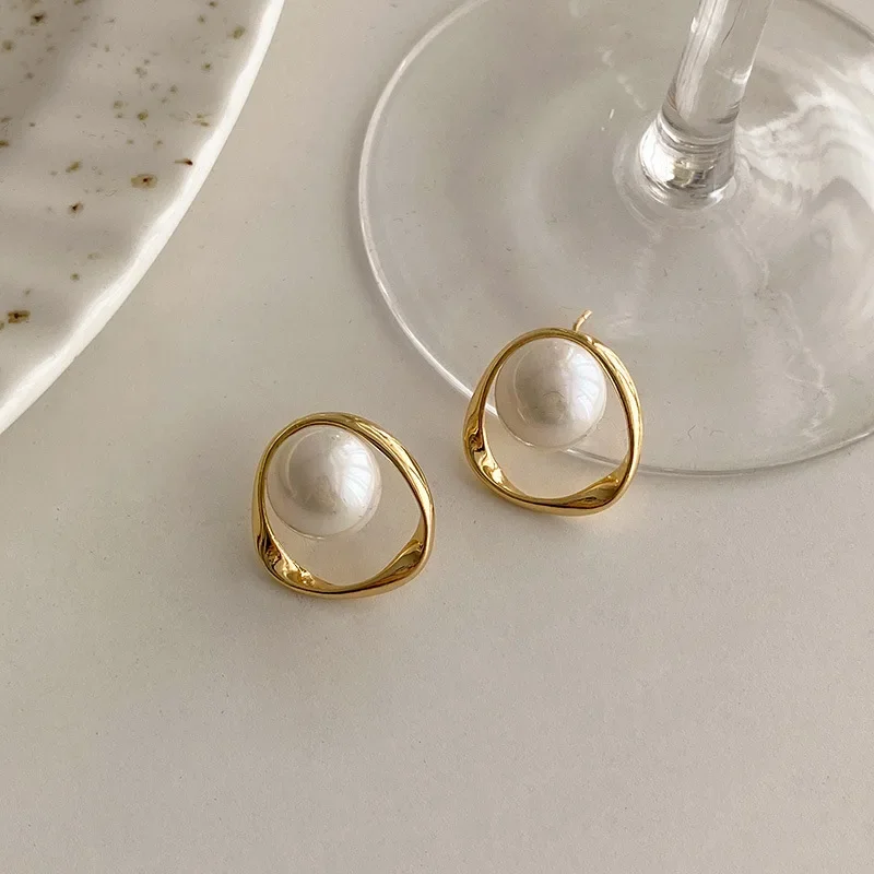 Fleepmart Imitation Pearl Women Gold Color Round Stud Earrings Korean Delicate Irregular Design Unusual Jewelry