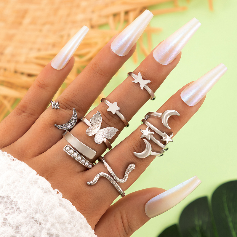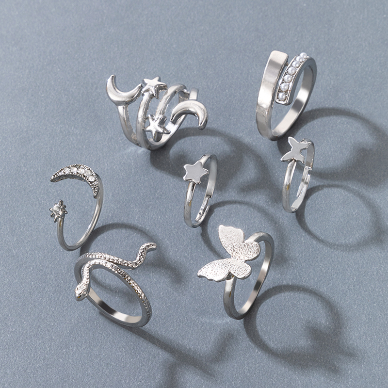 Fleepmart INS Butterfly Snake Joint Ring Sets for Women New Moon Star Pearl Stone Opening Ring Jewelry 7pcs/sets