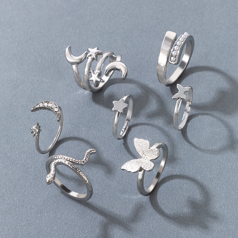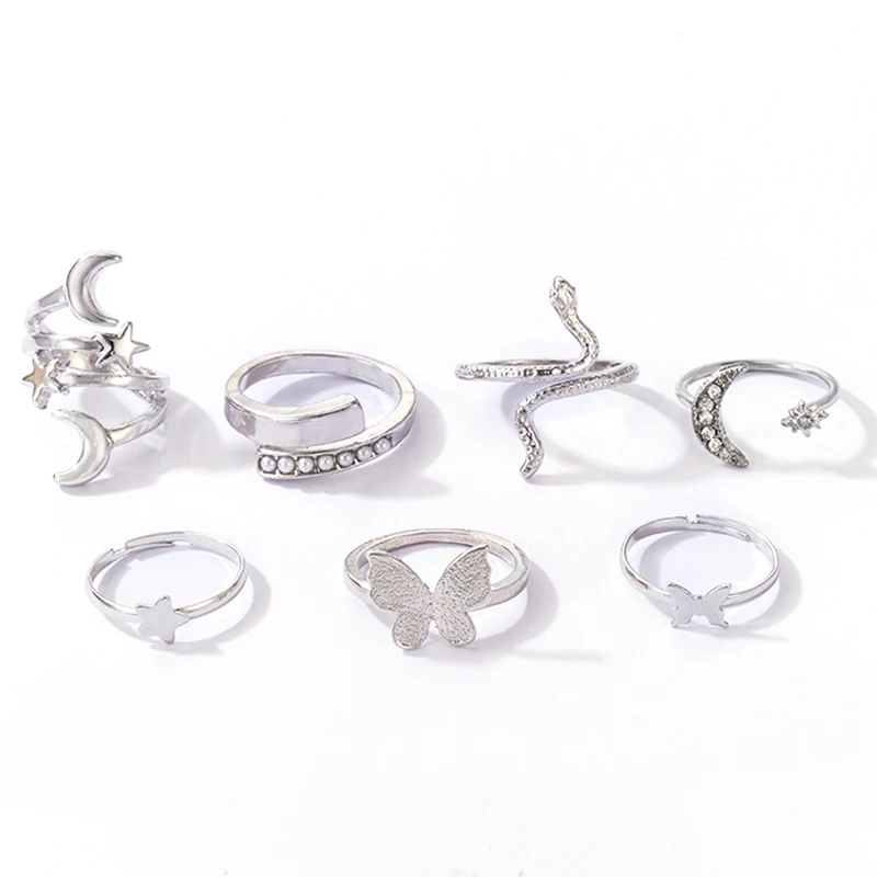 Fleepmart INS Butterfly Snake Joint Ring Sets for Women New Moon Star Pearl Stone Opening Ring Jewelry 7pcs/sets