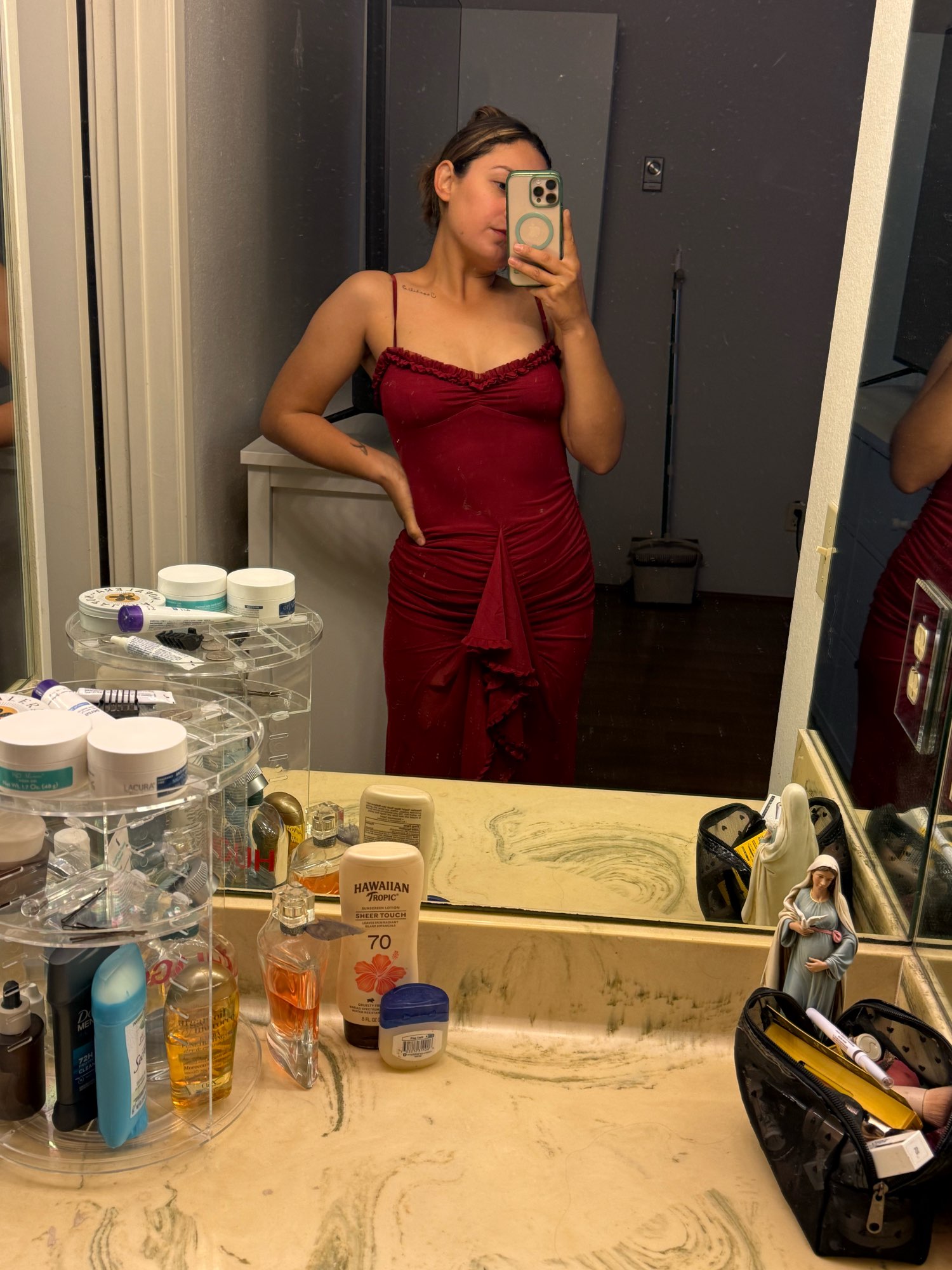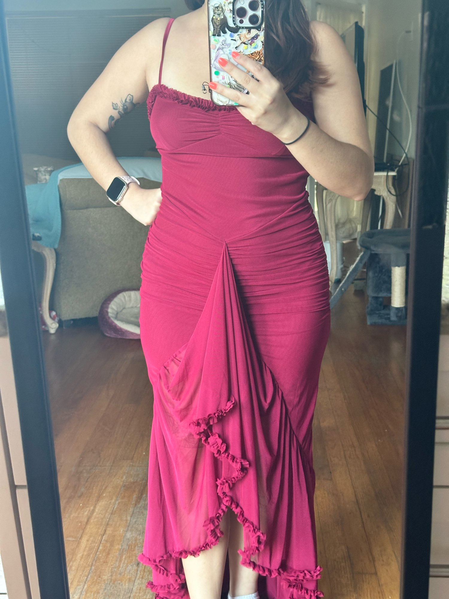 el vestido es HERMOSO, justo como se ve en las imágenes, la tela muy bonita y queda muy bonito pegado al cuerpo sin ser apretado, lo recomiendo 100%