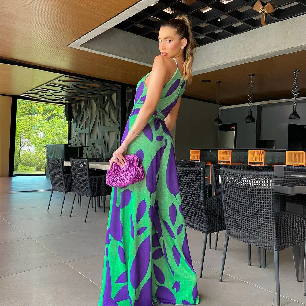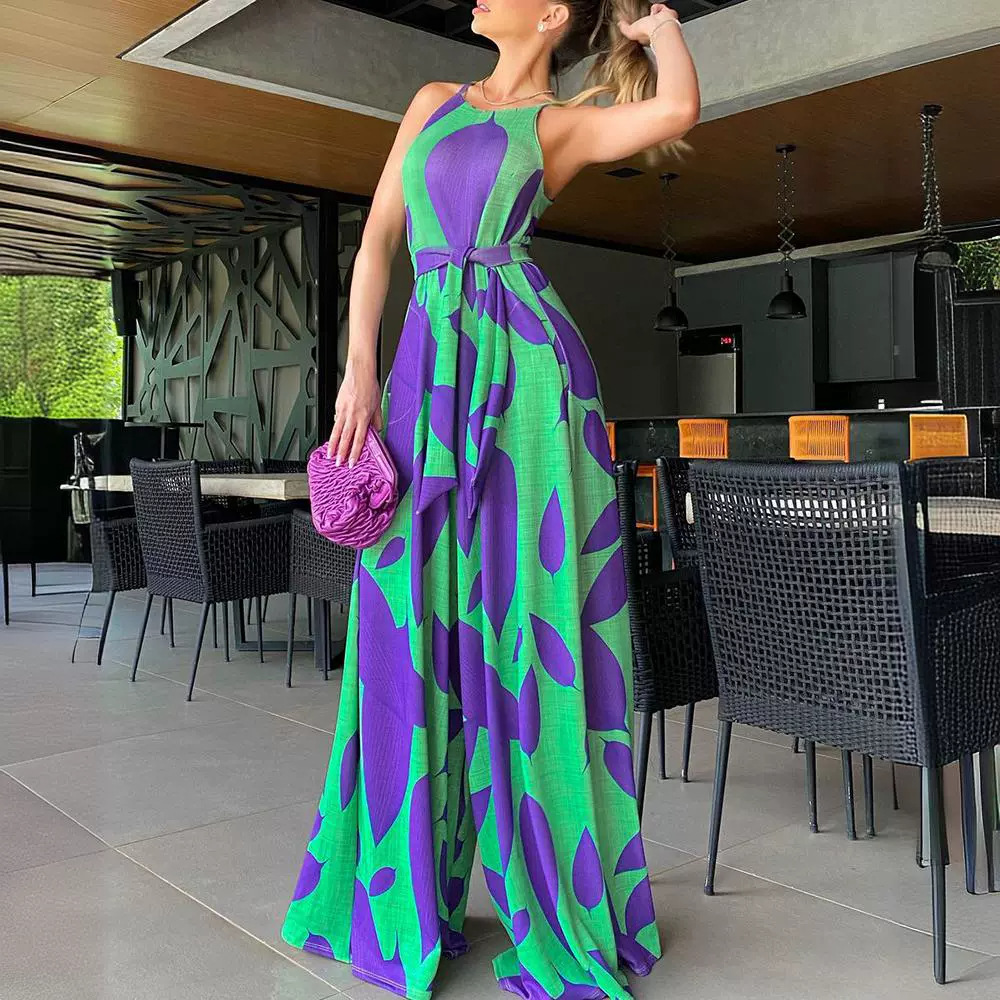 Fleepmart Jumpsuits Women Print Round Neck Sleeveless Casual Loose Overalls Wide Leg Long Pants Lace Up Rompers