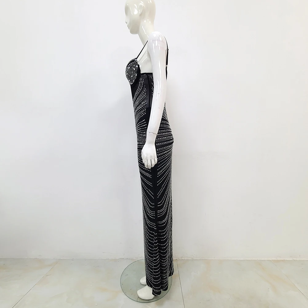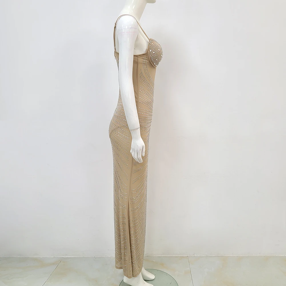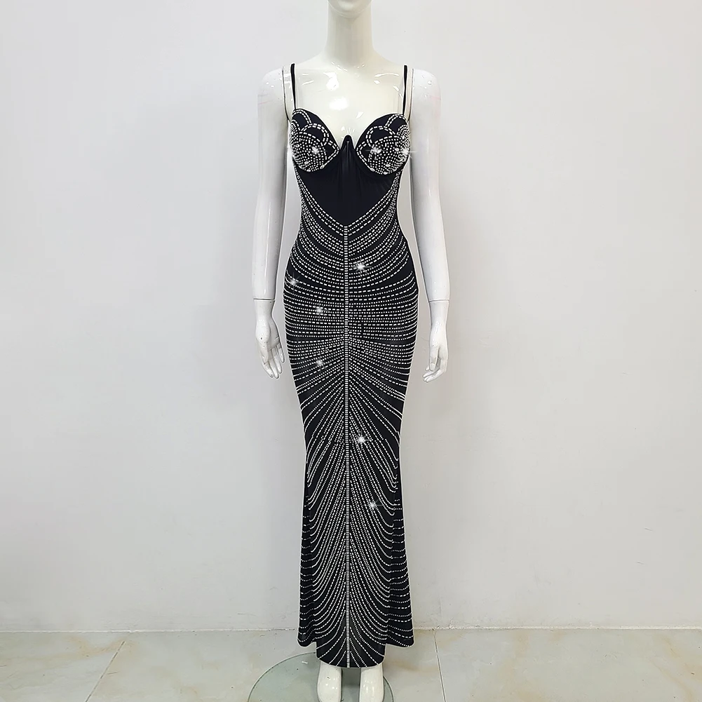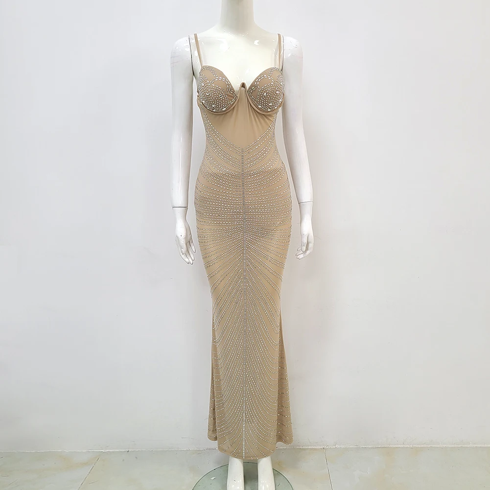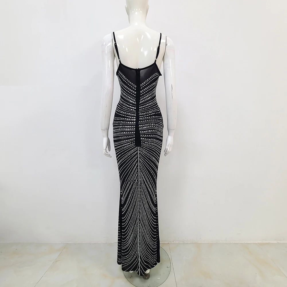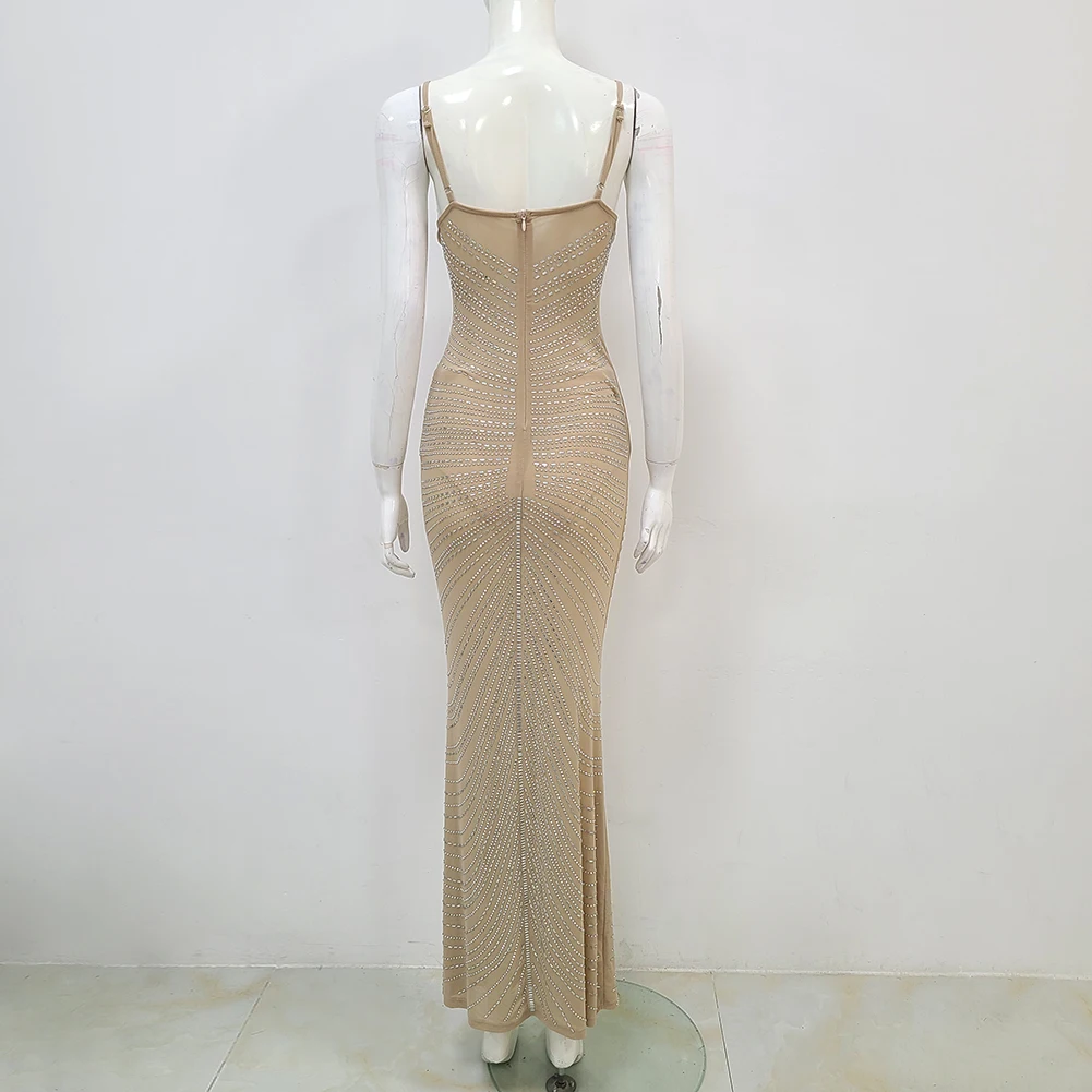 Fleepmart Khaki Black Color Women Sexy Strap V-Neck SHinning Crystal Bodycon Long Dress Celebrate Bar Singer Nightclub Party Dress