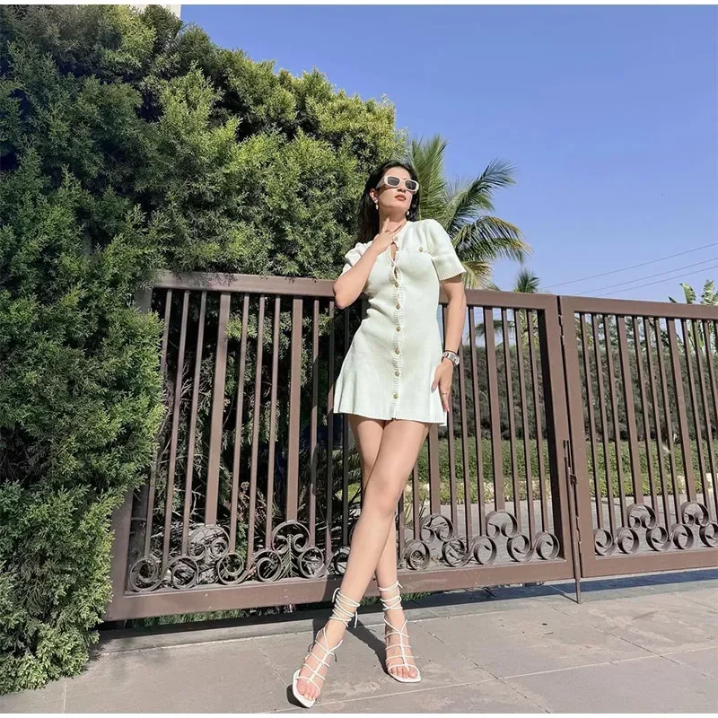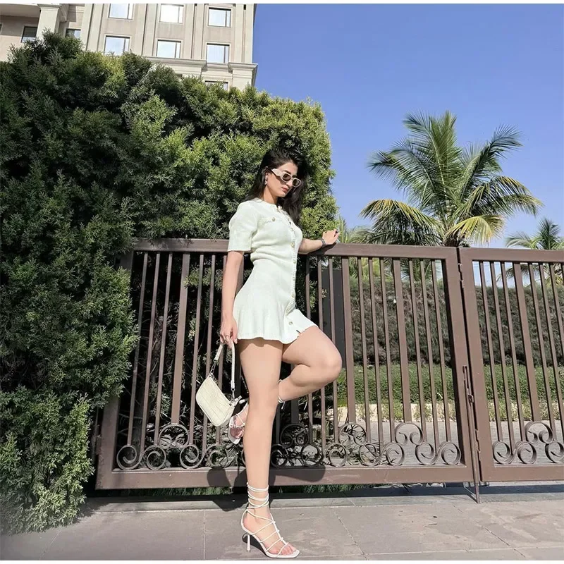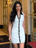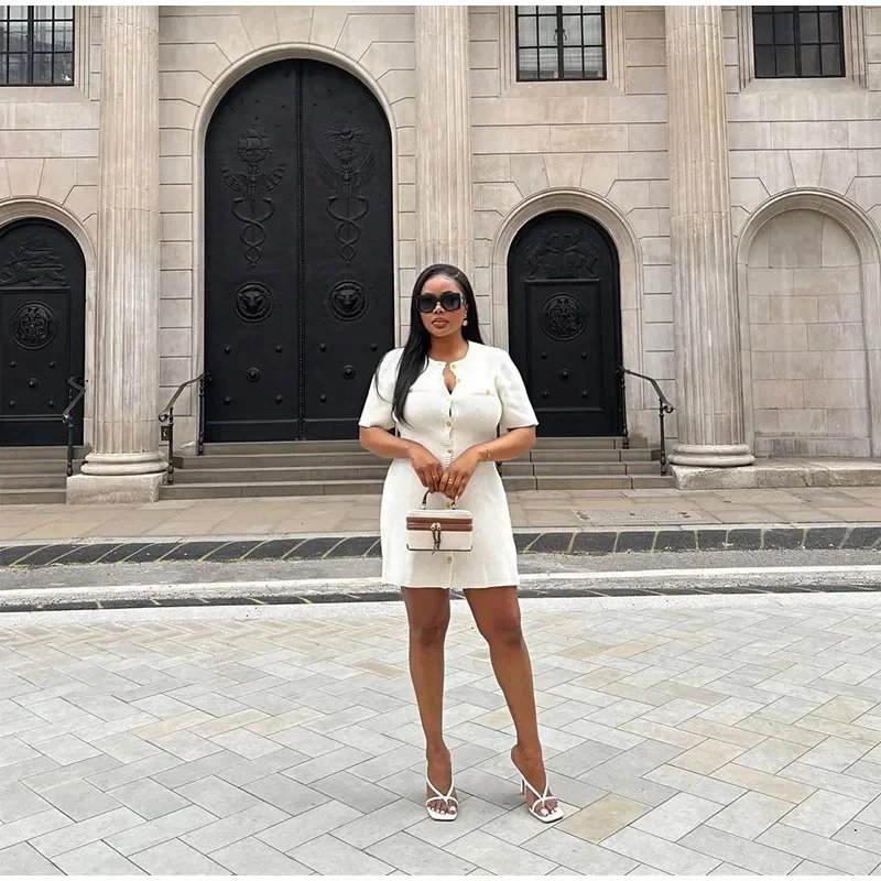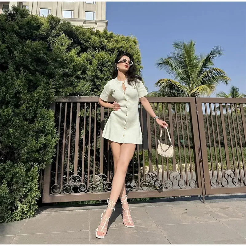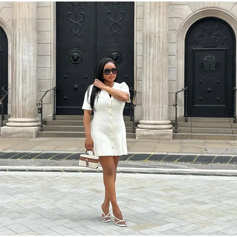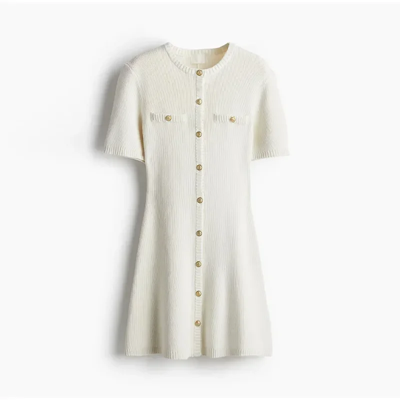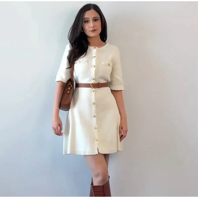 Fleepmart Knitted Fake Pocket Single Breasted Mini Dress Fashion O-neck Short Sleeve Bodycon A-line Dresses New Chic Office Lady Vestidos