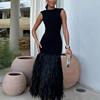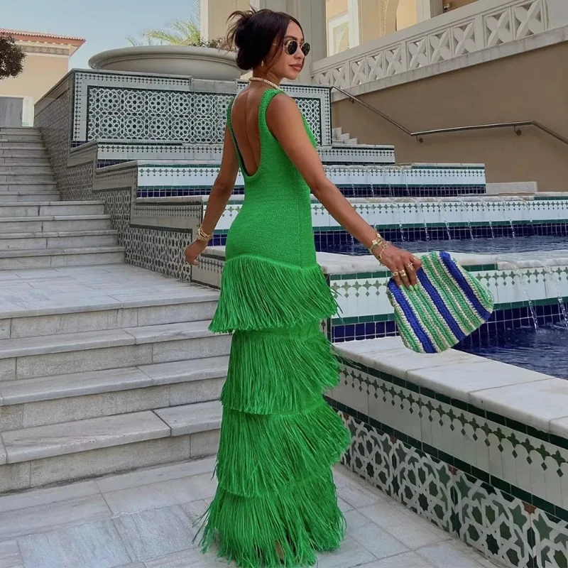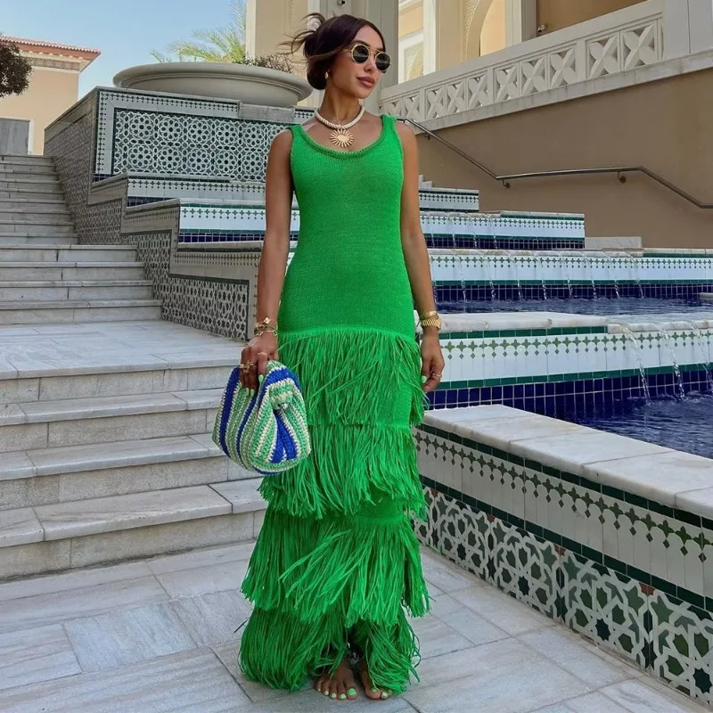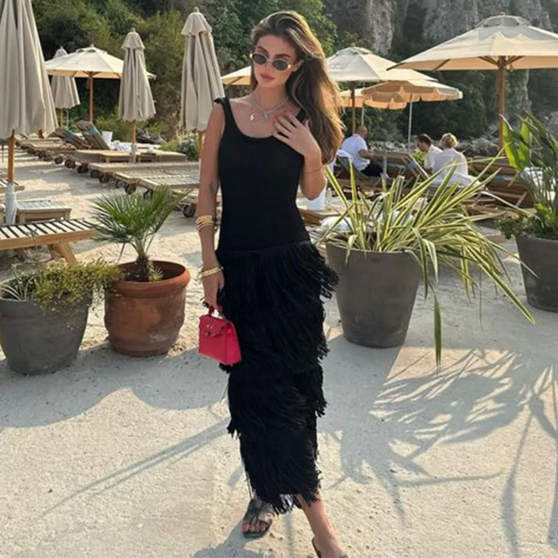 Fleepmart Knitted Slim Long Women High Waisted Sleeveless Solid Tassel Elegant Party Long Dress