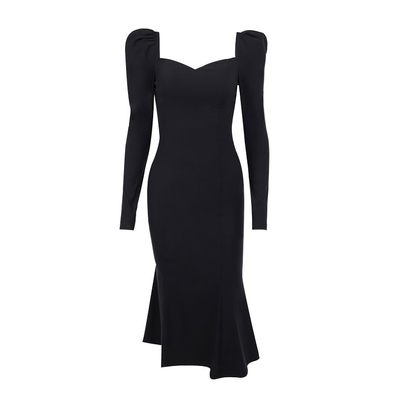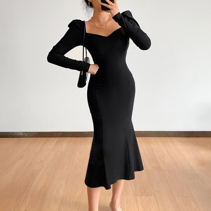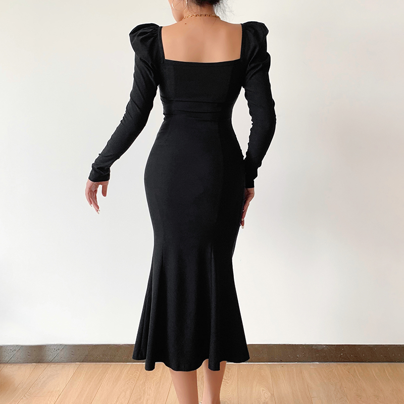 Fleepmart Knitted Women Dress Long Sleeve Square Collar Sexy Ruffle Hem Office Lady Elegant Black Fashion Maxi Robe Female 2022