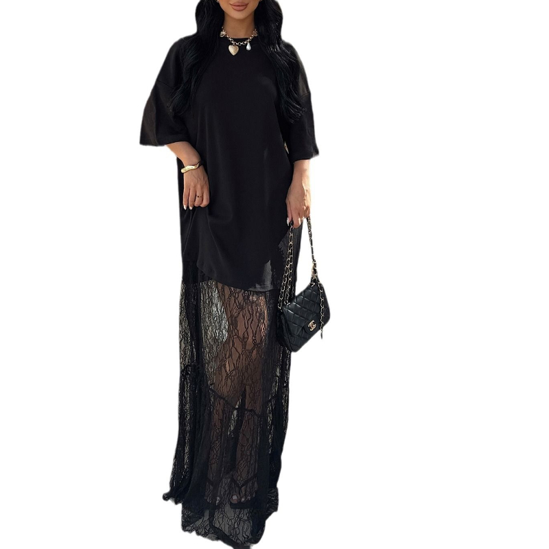 Fleepmart Lace Dress Round Neck Sweater Stitching Lace Skirt 2025 Spring and Summer Sexy Spice Women’s Dress