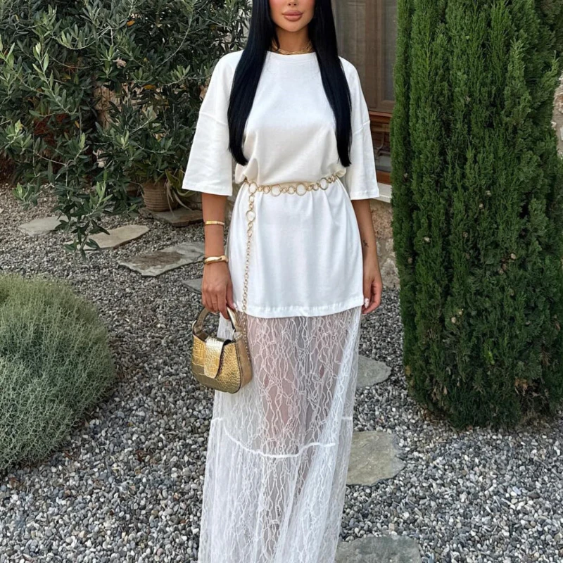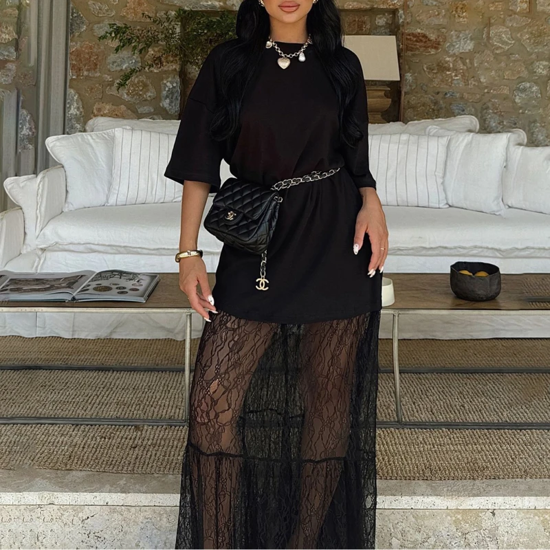 Fleepmart Lace Dress Round Neck Sweater Stitching Lace Skirt 2025 Spring and Summer Sexy Spice Women’s Dress