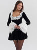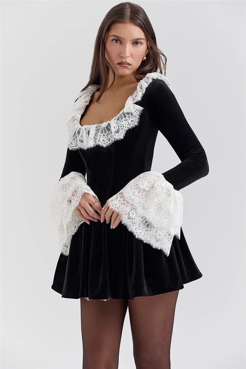 Fleepmart Lace Flare Long Sleeve Sexy Mini Dress Women Black Fashion Square Collar High Waist Pleated Club Party Dress Elegant