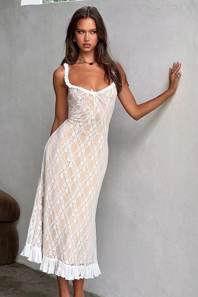 Fleepmart Lace Mesh Bodycon Midi Party Dress Women Apricot Ruffles Elegant Black Sexy Club Shealth Dress Robe 2024 Tank