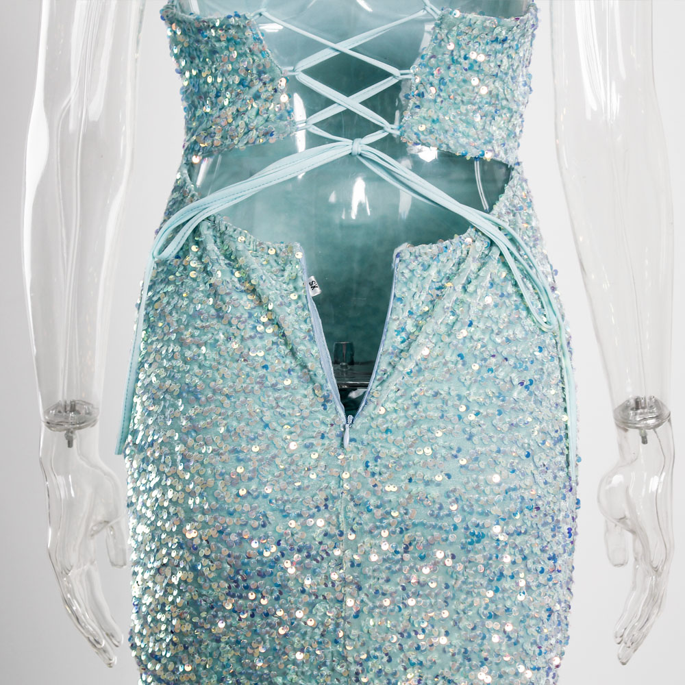 Fleepmart Lace UP V Neck Sleeveless Sequined Mermaid Maxi Dress Evening Party Backless Hollow Out Split Front
