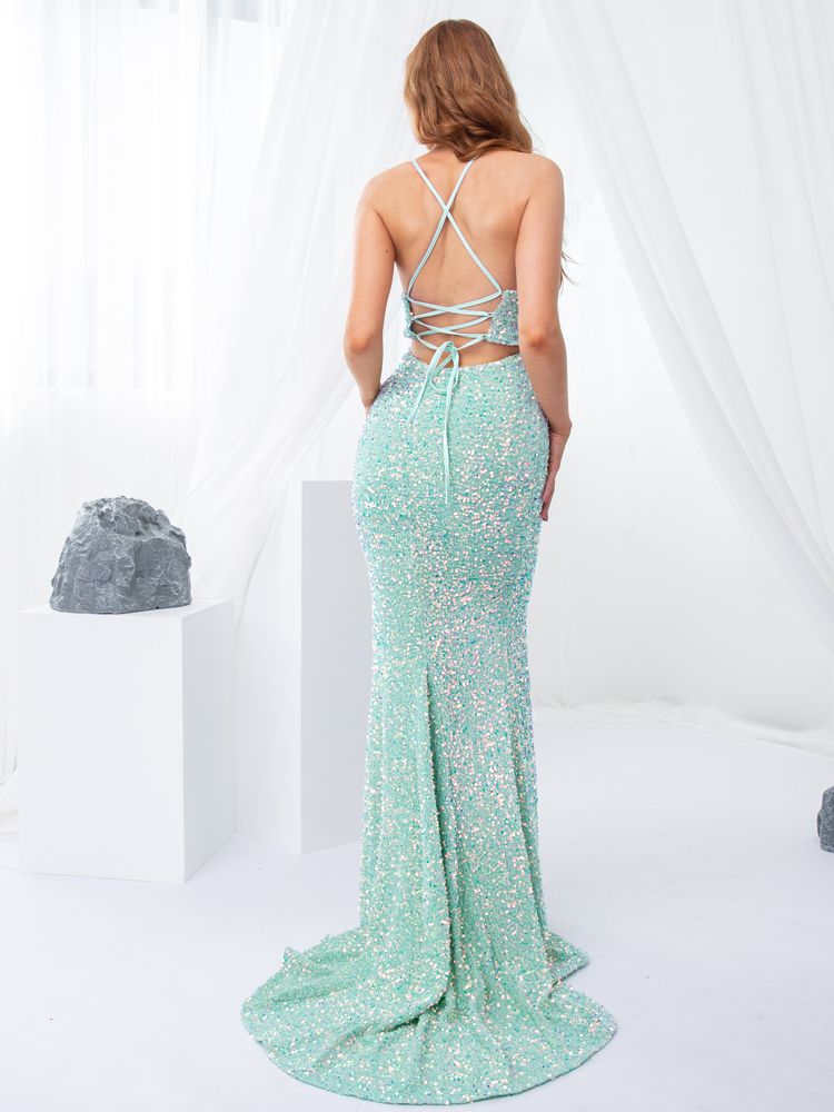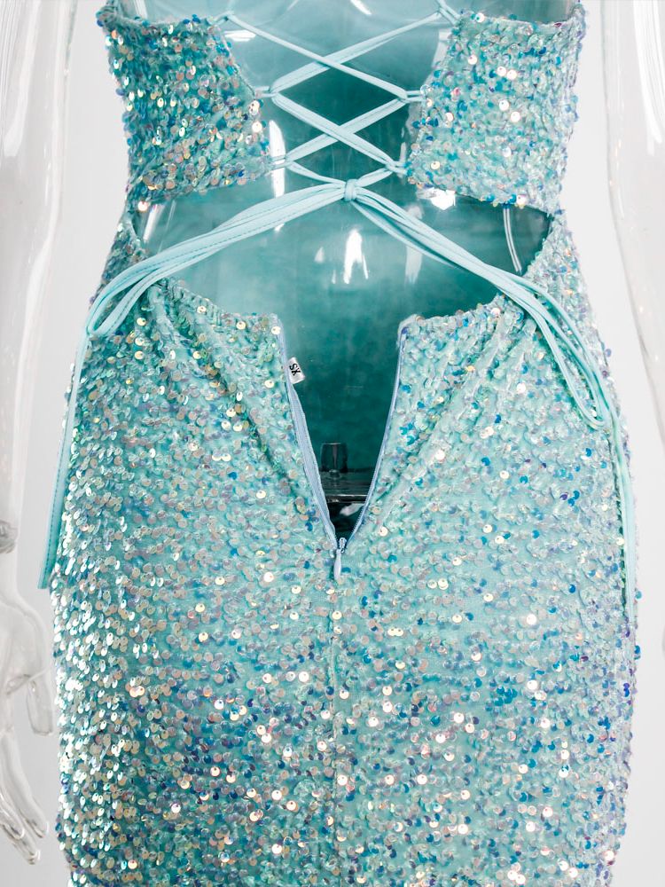 Fleepmart Lace UP V Neck Sleeveless Sequined Mermaid Maxi Dress Evening Party Backless Hollow Out Split Front