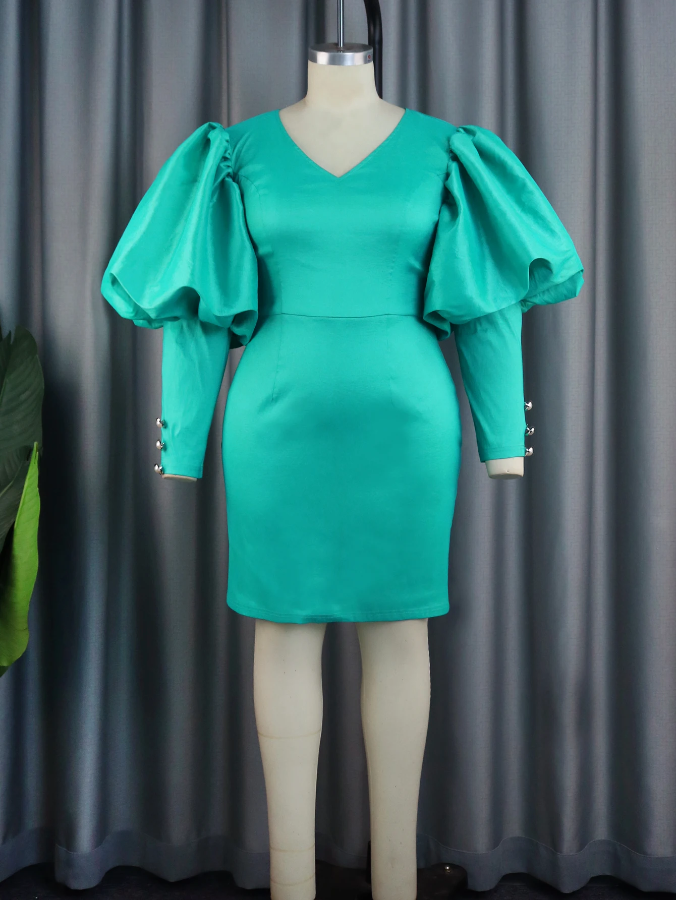 fleepmart Large Size Evening Birthday Green Mini Dress V Neck Long Puff Sleeve Bodycon Cocktail Party Gowns For Women Autumn Plus Size