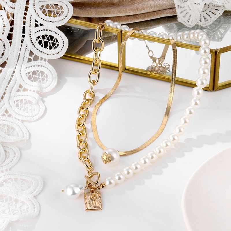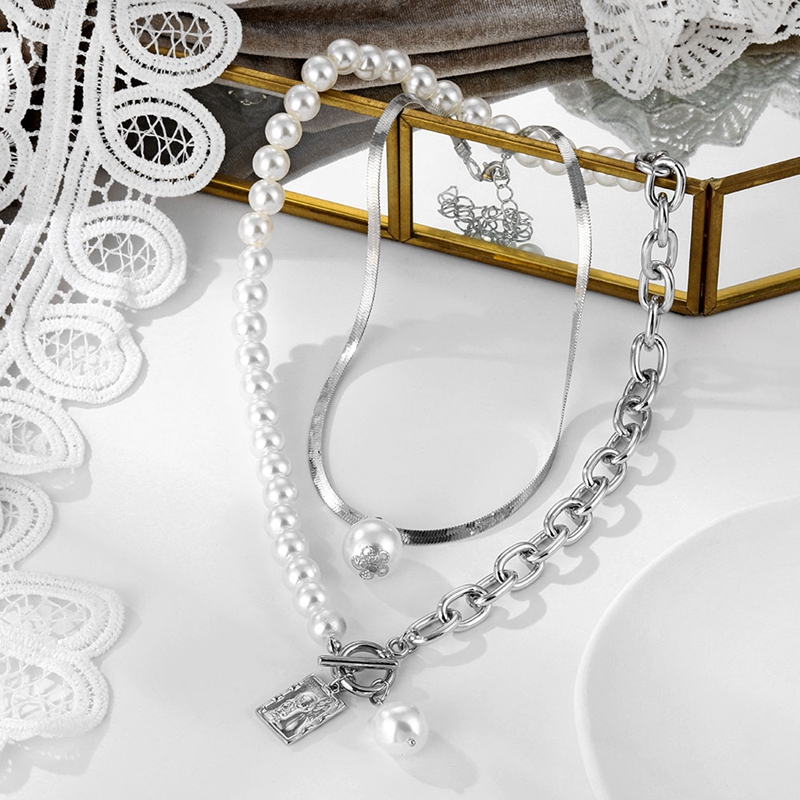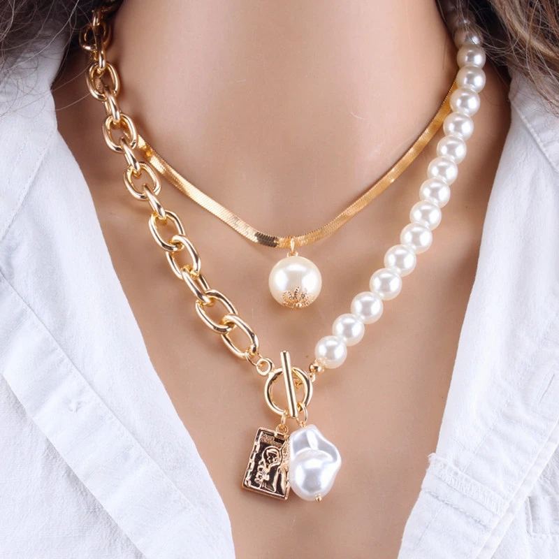 Fleepmart Layered Punk Chain Necklace Key Lock Pendant Metal Imitation Pearl Necklaces Cuban Link Chain Goth Accessory For Women