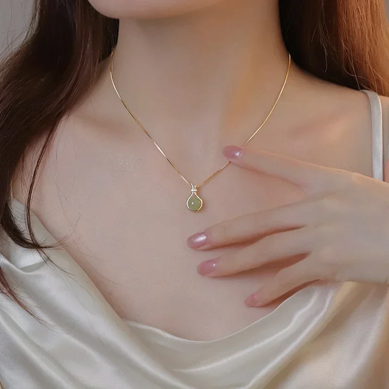 Fleepmart Light Green Jade Pendant Necklaces Stainless Steel Women Trendy Retro Style Clavicle Chain Jewelry