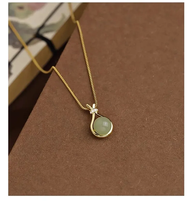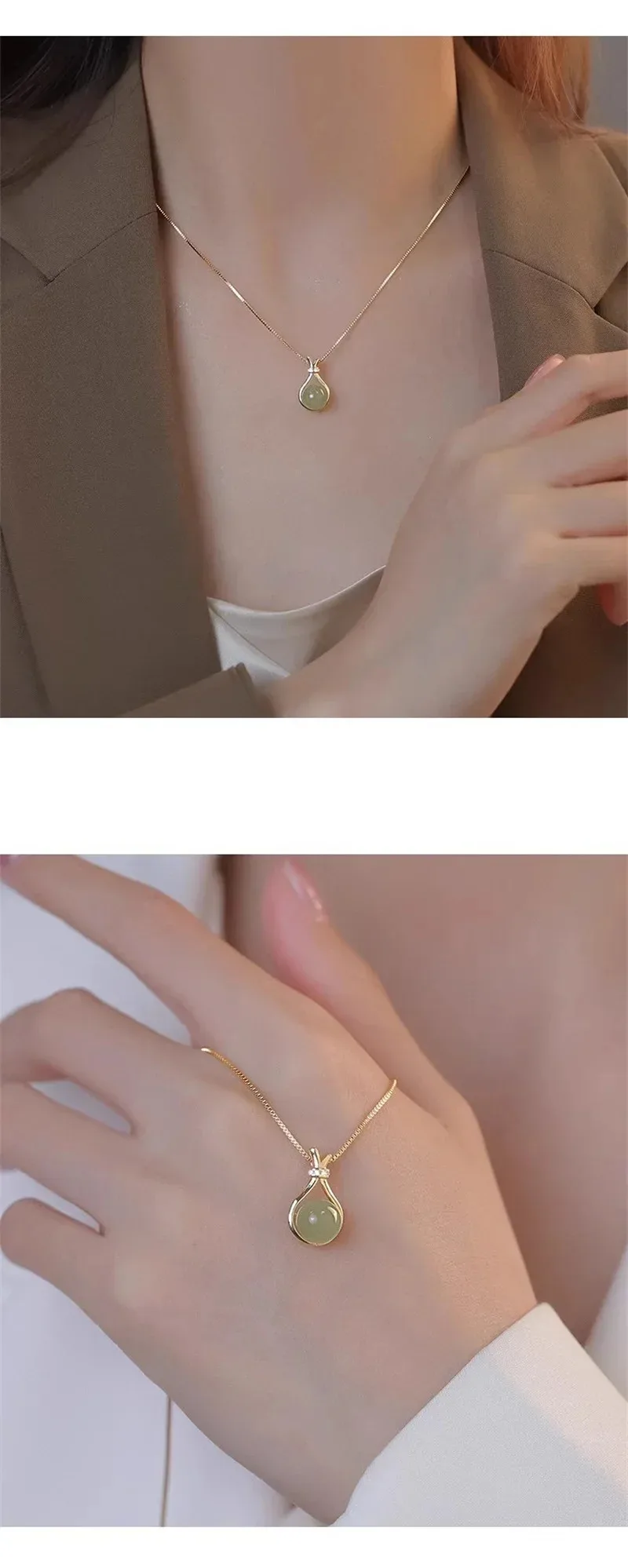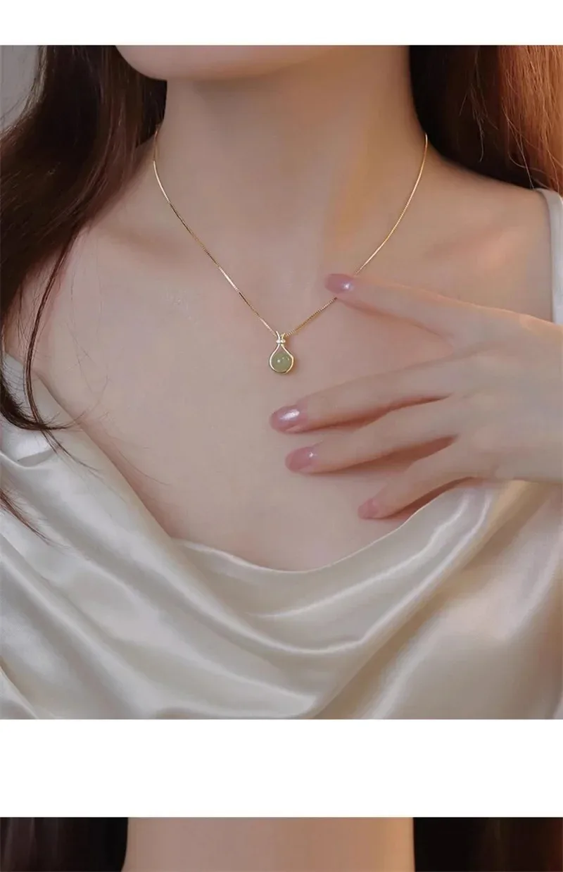 Fleepmart Light Green Jade Pendant Necklaces Stainless Steel Women Trendy Retro Style Clavicle Chain Jewelry