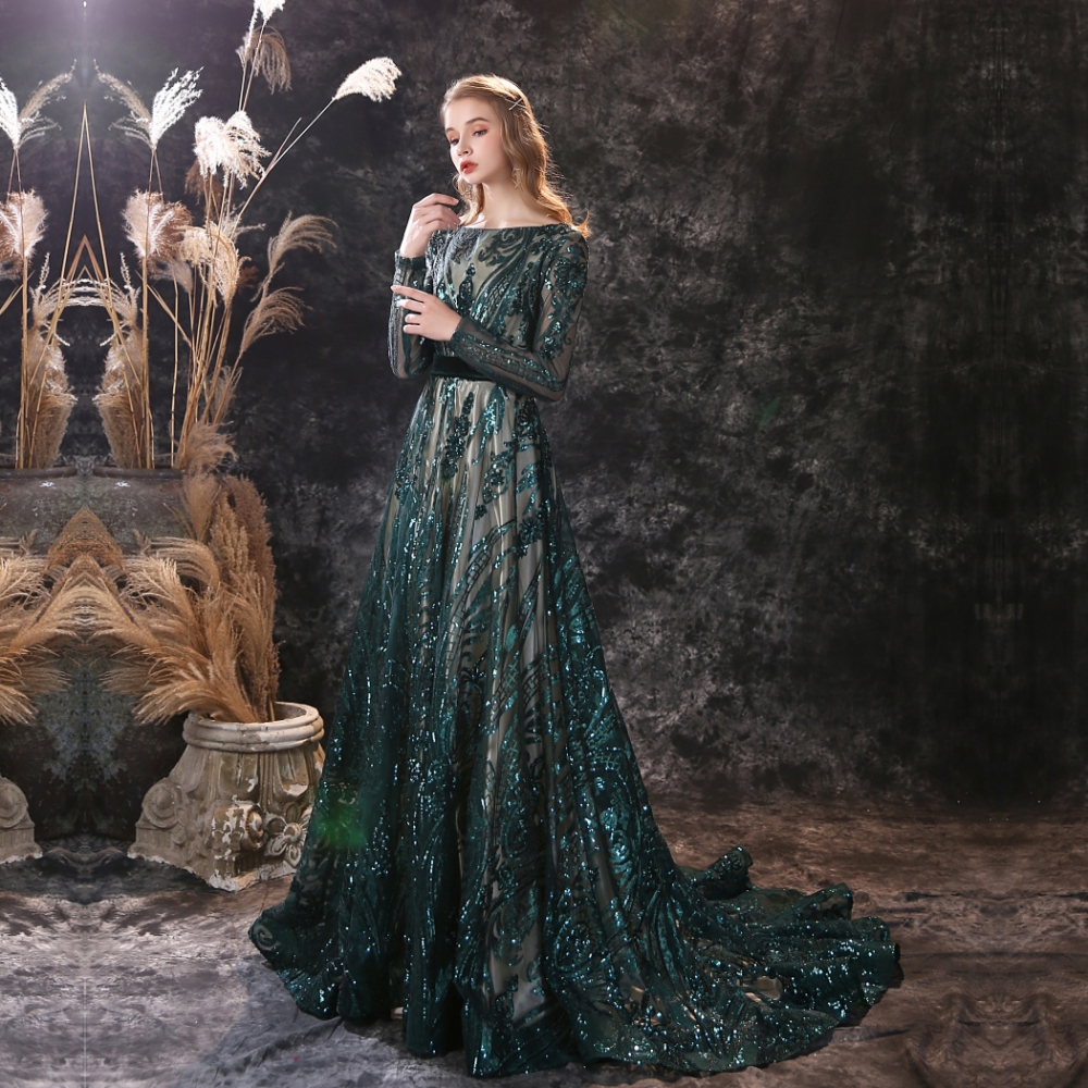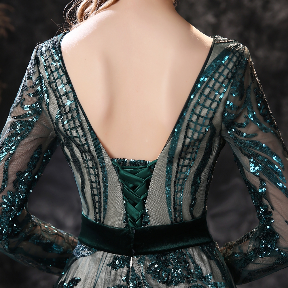 Fleepmart Long Evening Dresses Elegant Muslim Mermaid Long Sleeve Sequined Hunter Green Prom Party Formal Gown
