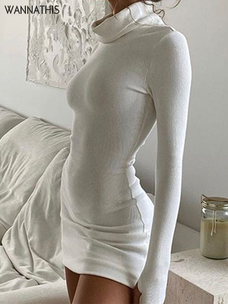 Fleepmart Long Sleeve Hight Neck Sexy Mini Bodycon Dresses Women Autumn Winter Cotton White Skinny Elastics Elegant Dress Solid
