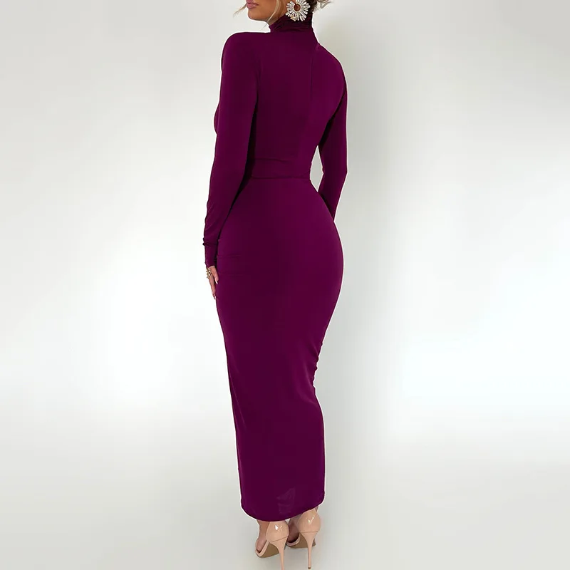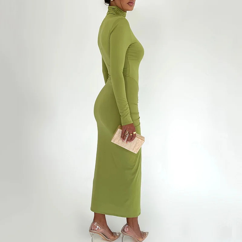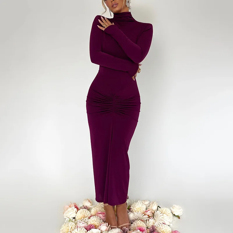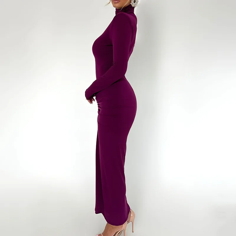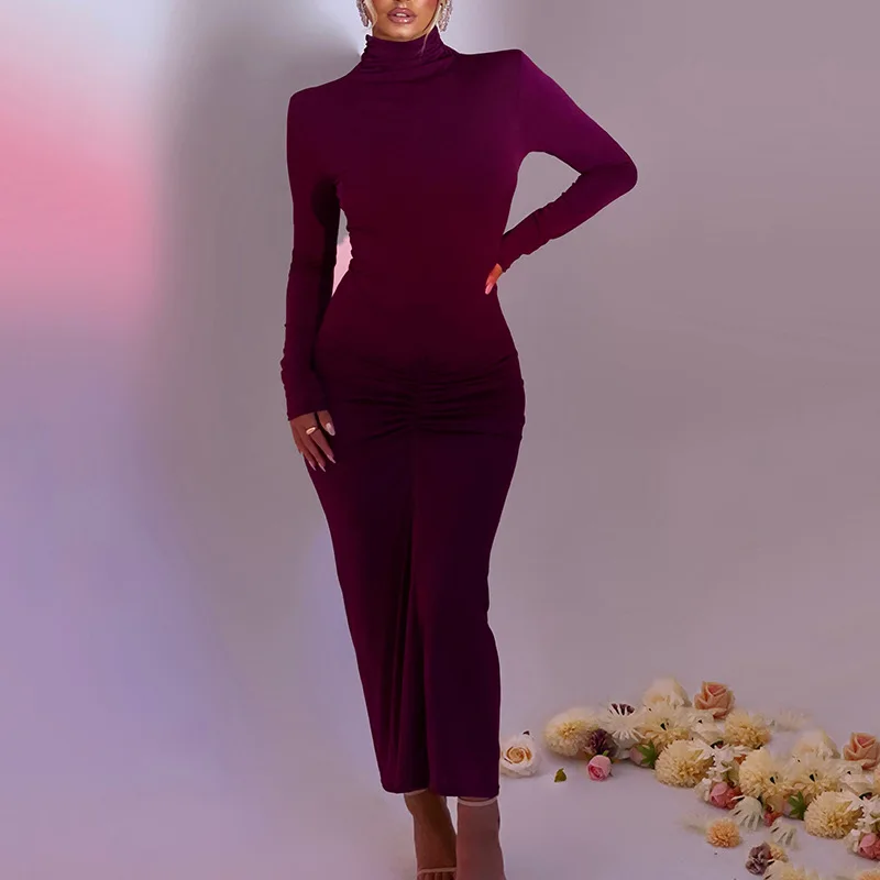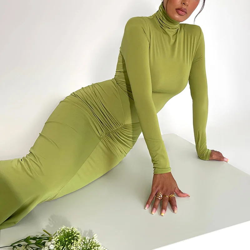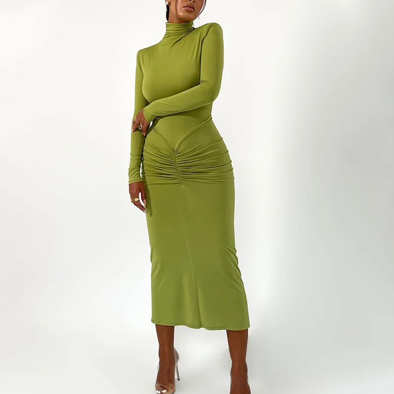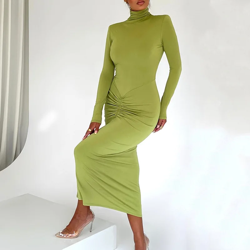 Fleepmart Long Sleeve Ruched Bodycon Dress Women Turtleneck Bandage Long Dresses Autumn Black Skinny Stretchy Party Vestidos